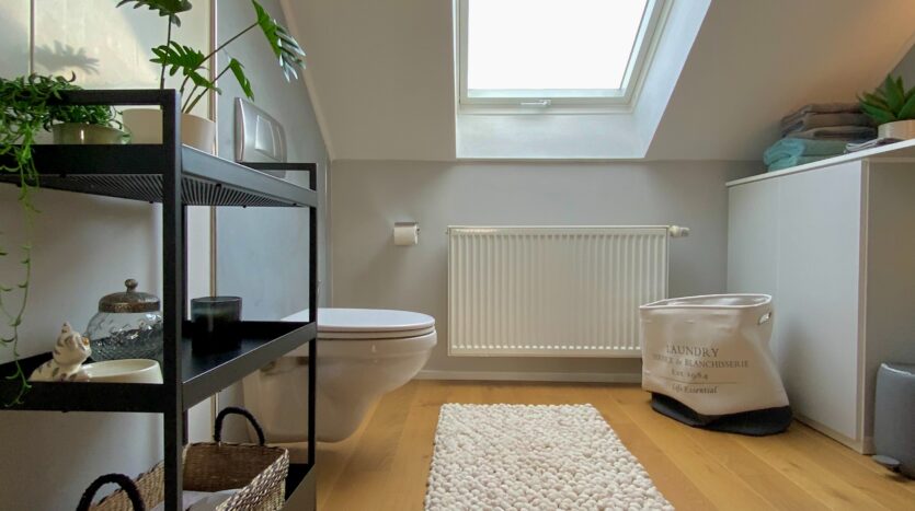 De trap leidt naar de zolder. Hier vindt u een volledig uitgerust appartement met een keuken-woonkamer/eetkamer, slaapkamer en een hoogwaardige badkamer met douche, toilet en wastafel. Dit appartement is toegankelijk via de gemeenschappelijke hal op de begane grond en de eerste verdieping en heeft geen aparte ingang.