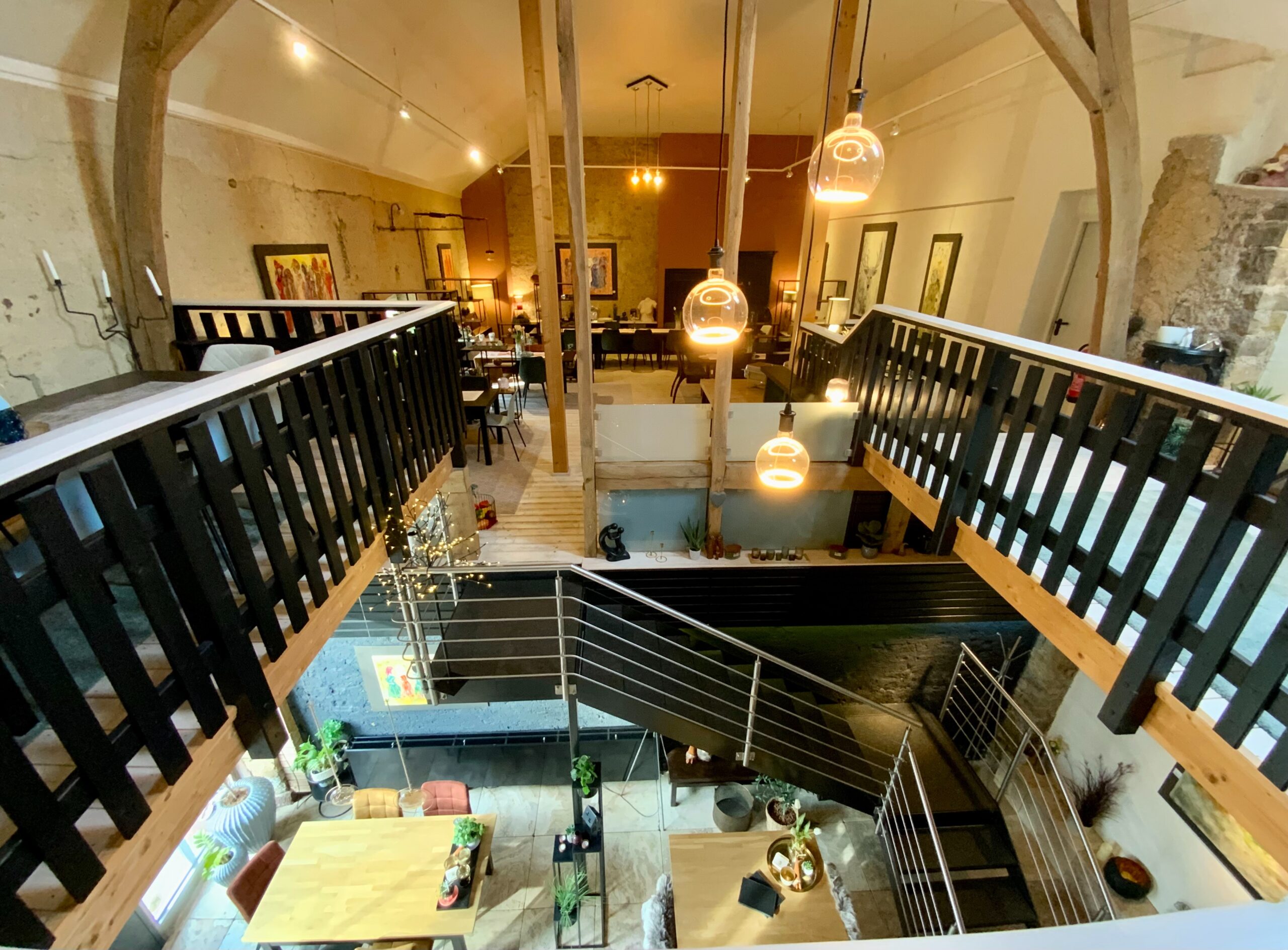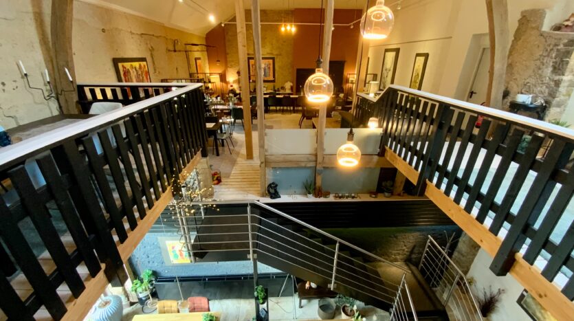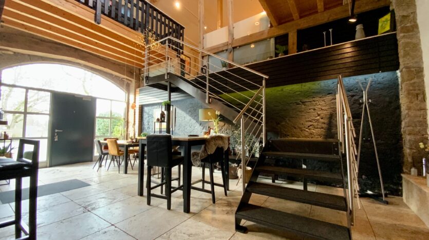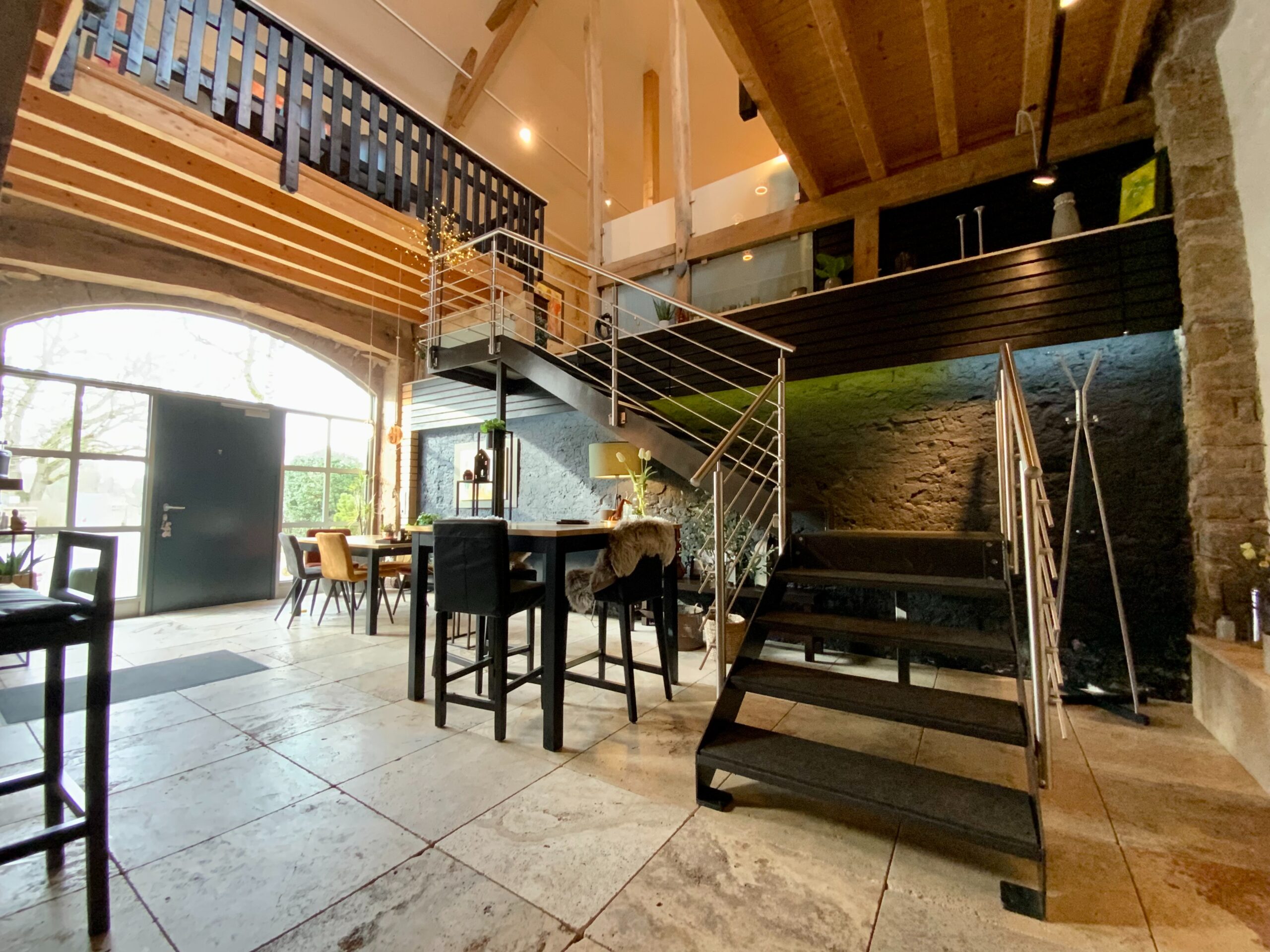 Dankzij de doordachte indeling kan deze ruimte voor diverse doeleinden worden gebruikt. Een op maat gemaakte stalen trap met natuurstenen treden leidt naar de bovenverdieping. Vanaf hier biedt de galerij uitzicht op de begane grond. Deze verdieping beschikt over een zeer grote keuken.