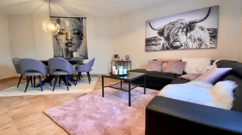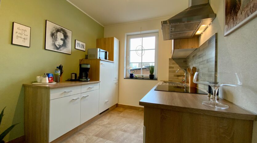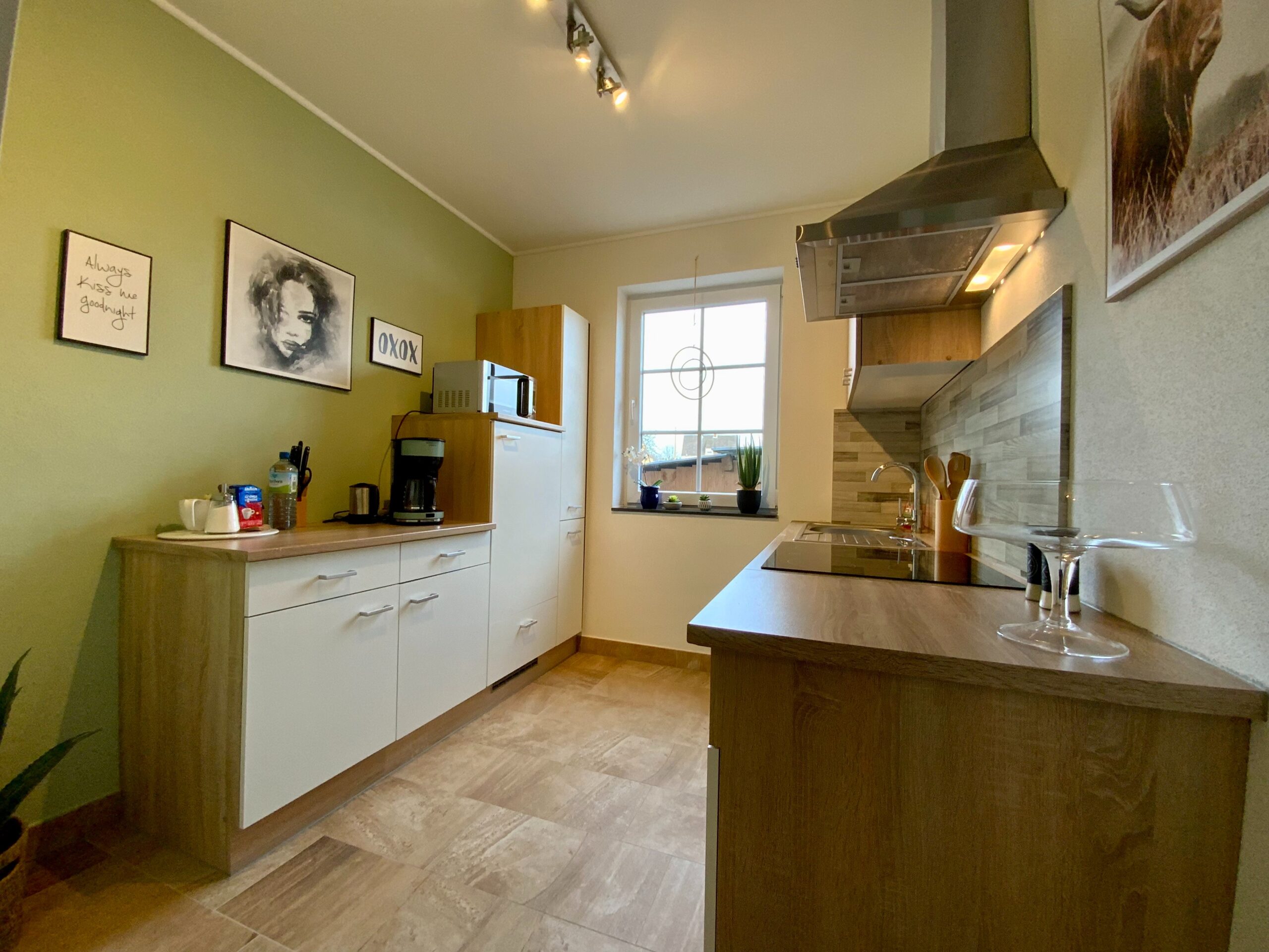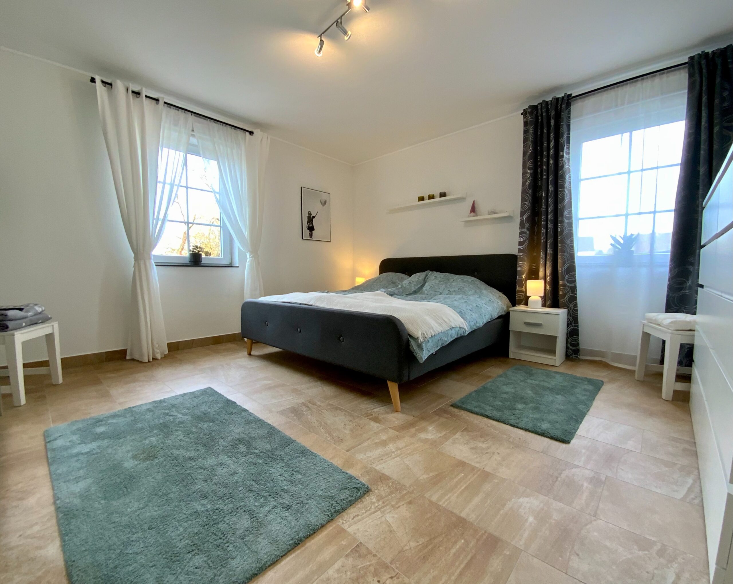 Über einen Flur erreicht man die großzügige und neuwertige Mitarbeiter-, Gästewohnung. Hier befinden sich eine Küche, großer Wohnbereich, 2 Schlafzimmer und ein Badezimmer.