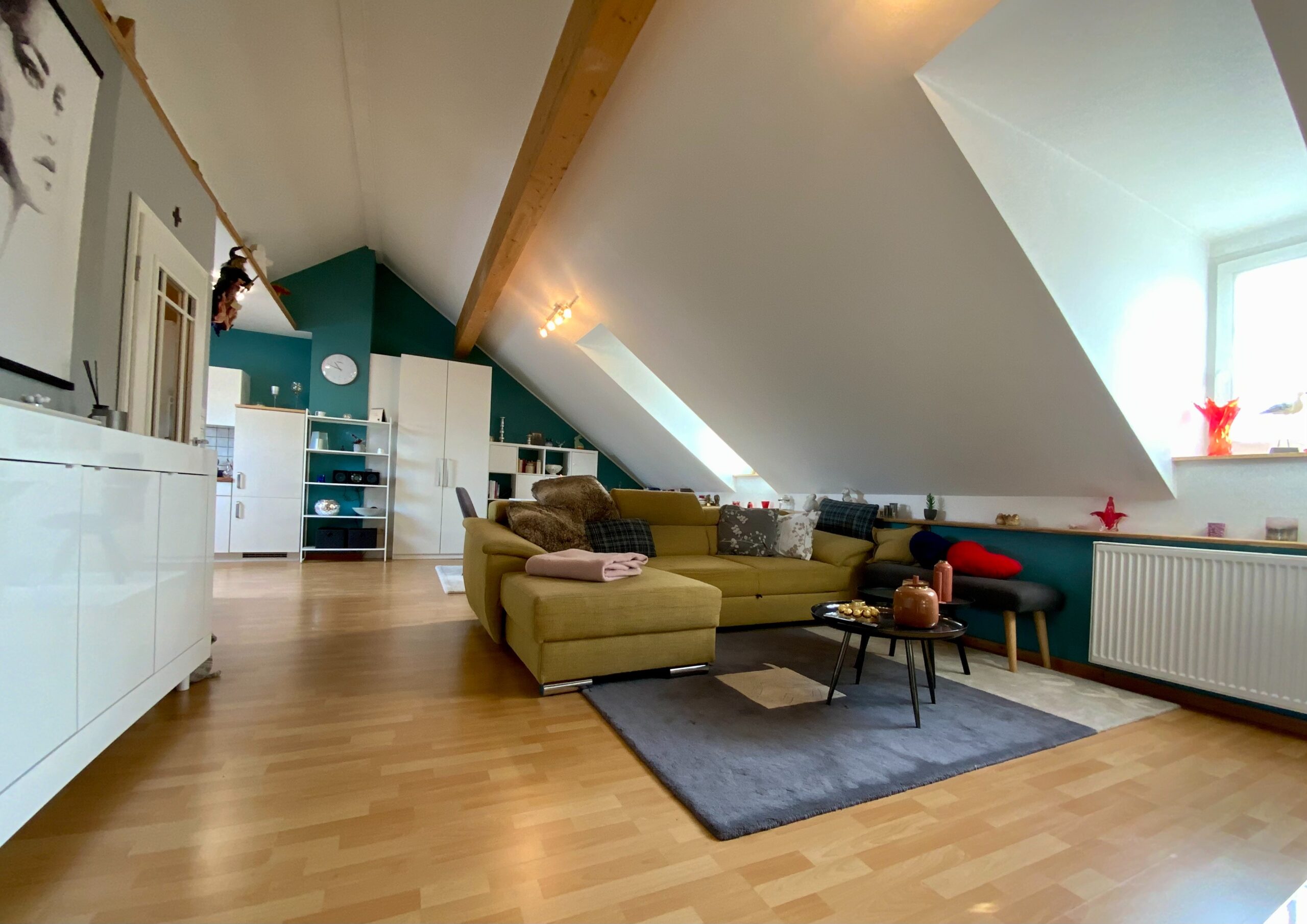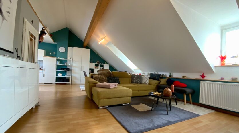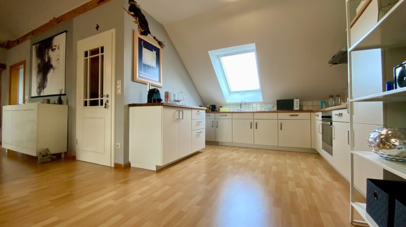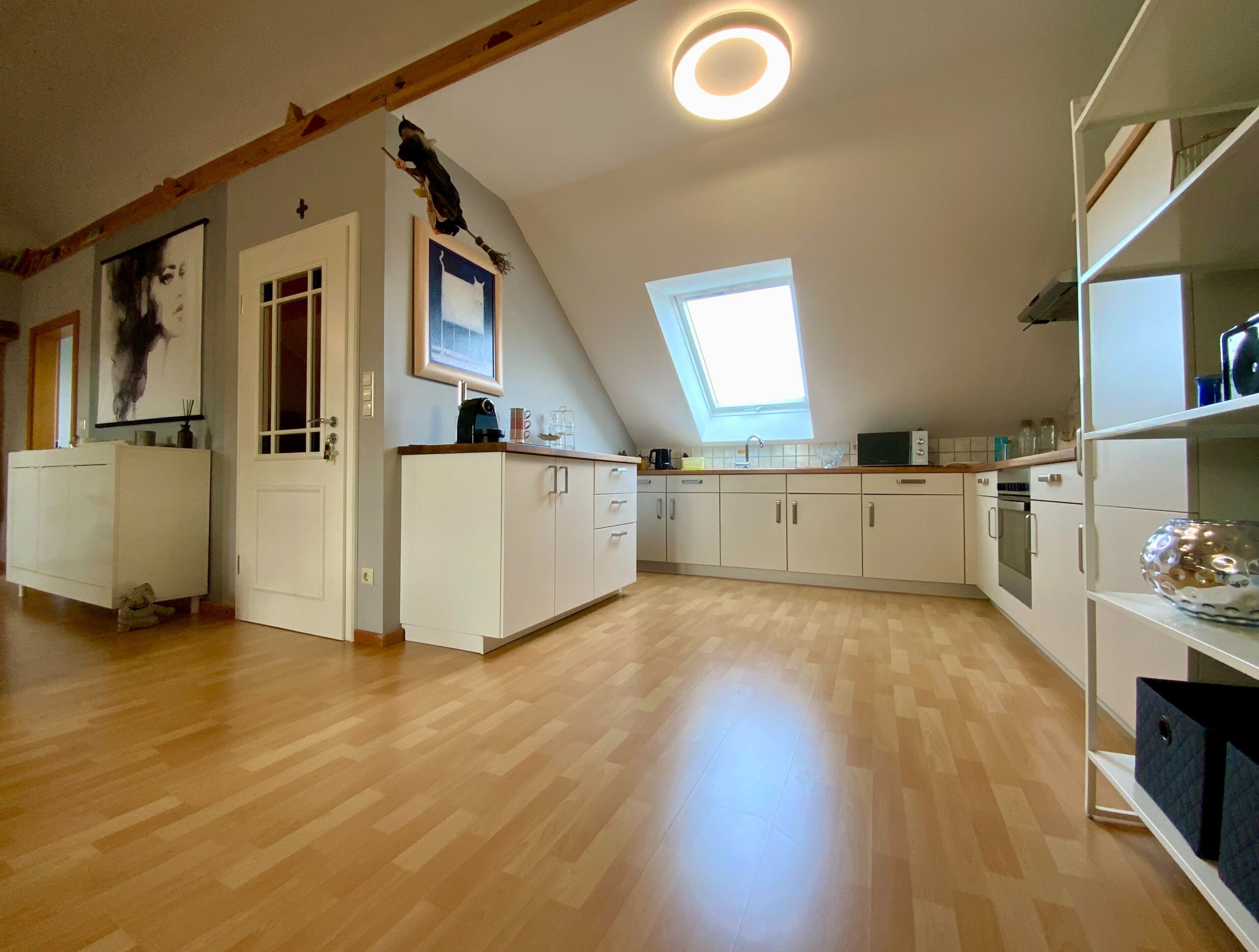 Über die Treppe gelangt man ins Dachgeschoss. Hier befindet sich eine komplett ausgestatte Wohnung mit Wohnküche / Essbereich, Schlafzimmer und ein hochwertiges Badezimmer mit Dusche, Toilette und Waschbecken. Diese Wohnung ist vom gemeinsamen Flur vom EG und OG erreichbar und hat keinen separaten Eingang.