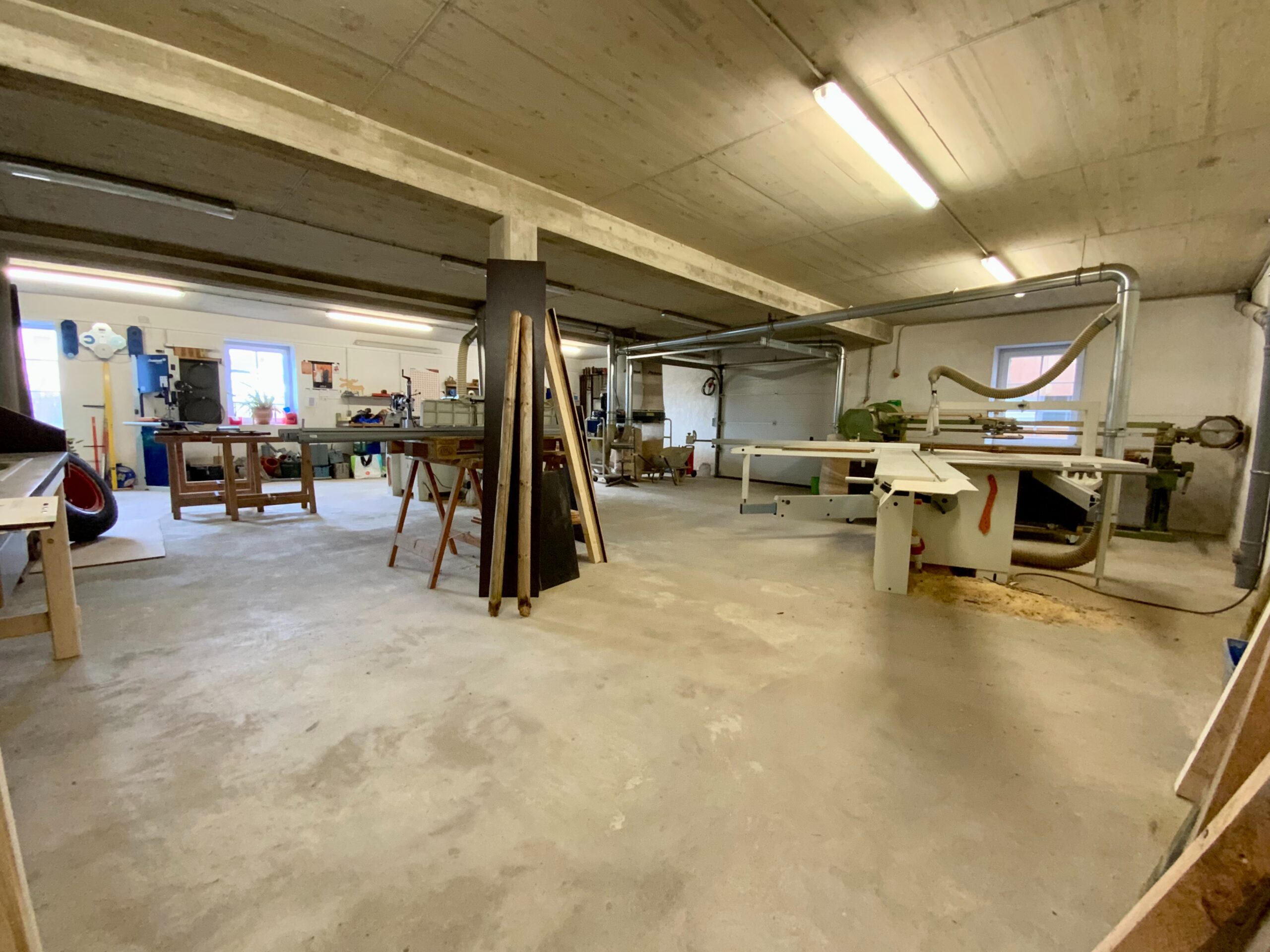 Die großzügige Garage / Werkstatt die momentan als Holzwerkstatt genutzt wird hat einen direkten Zugang über ein großes Tor von der Hofseite aus. Auch hier bestehen vielfältige Nutzungsmöglichkeiten.