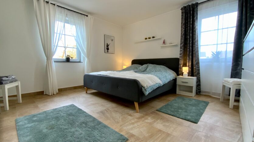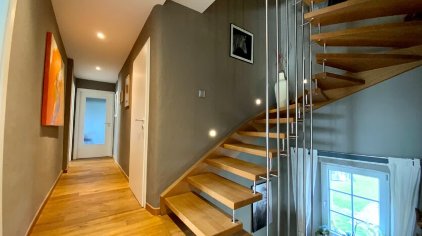 Über die Treppe gelangt man im Obergeschoss in den Flurbereich der sich zentral im Haus befindet. Hier befinden sich 2 Schlafzimmer mit begehbarem Kleiderschrank, Büro, Waschküche und ein hochwertiges Badezimmer mit Wanne, Toilette und Waschbecken.