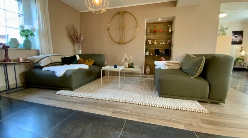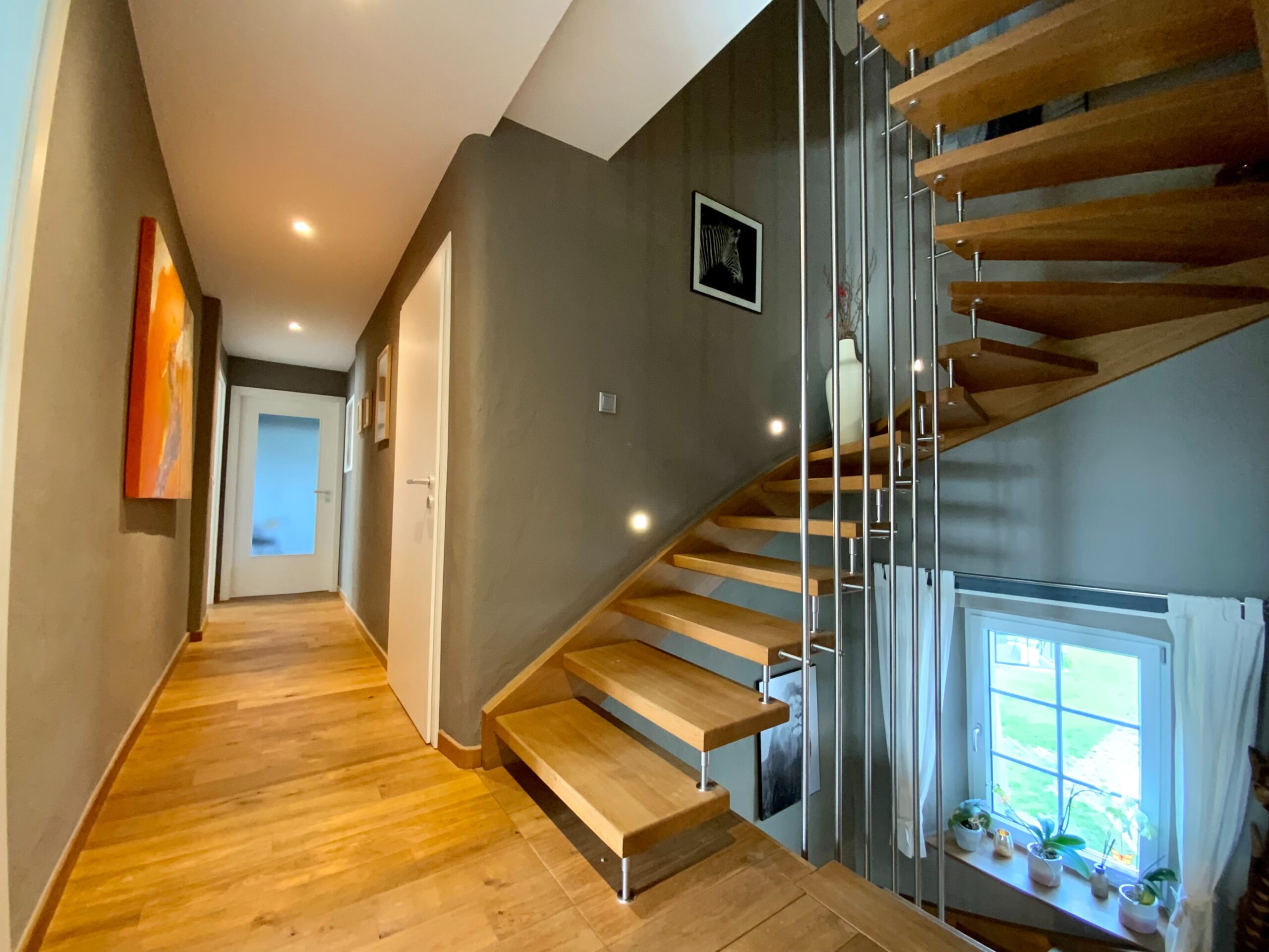 Im Erdgeschoss erreicht man über einen Flur die Garderobe und ein Gäste WC. Von dort aus erreicht man das schöne großzügige L-förmige Wohnzimmer mit Holzofen auf einer Fläche von ca. 64 m2. Vom Wohnzimmer aus hat man auf zwei Seiten einen Blick zum wunderschön angelegten Garten. Rechts vom Flur befindet sich eine neuwertige und moderne Küche aus dem Jahr 2022. Neben der Küche befindet sich ein großer Abstellraum der zu einem weiteren Flur führt, von wo aus dem restlichen Gebäude erreicht werden kann.