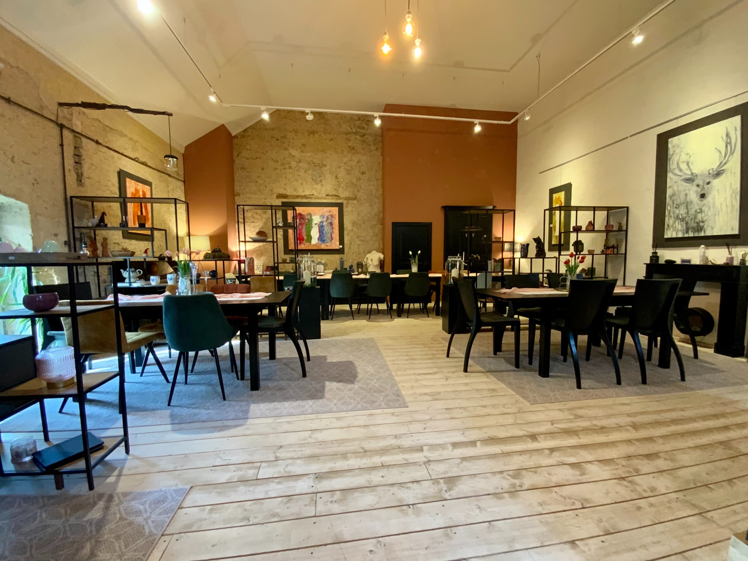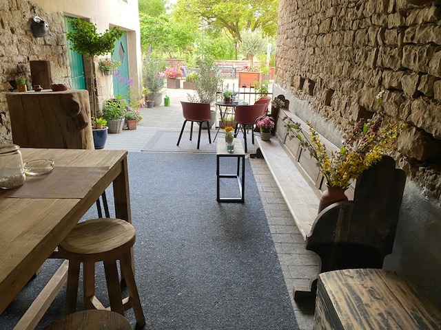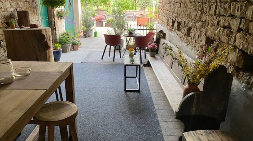 Achter het pand bevindt zich een multifunctionele zaal die toegankelijk is via een grote geplaveide binnenplaats.