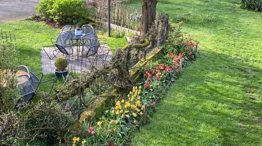 Voor de geheel gerenoveerde boerderij ligt een comfortabel aangelegde en omheinde tuin.