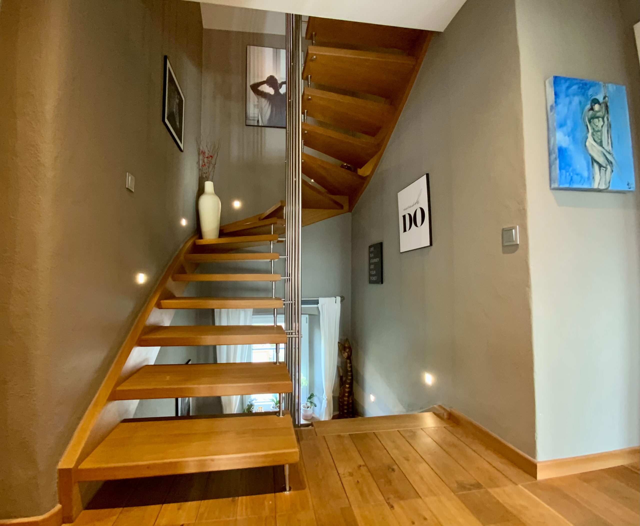 Durch die gut überlegt Aufteilung wäre dieser Bereich für mehrere Zwecken zu nutzen. Über eine speziell angefertigte Stahltreppe mit Natursteinstufen erreicht man das Obergeschoss. Von hieraus hat man über die Empore einen Blick ins Erdgeschoss. Auf dieser Ebene befindet sich ein sehr großer Küchenbereich.