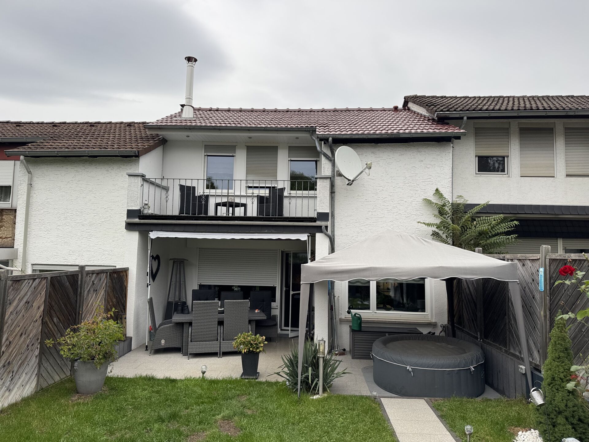 Das Haus verfügt über ein modernes Badezimmer mit großem Dachfenster, ergänzt durch ein praktisches Gäste-WC, sowie über eine sonnige Terrasse und einen charmanten Balkon, die beide den perfekten Rückzugsort an frischer Luft bieten.