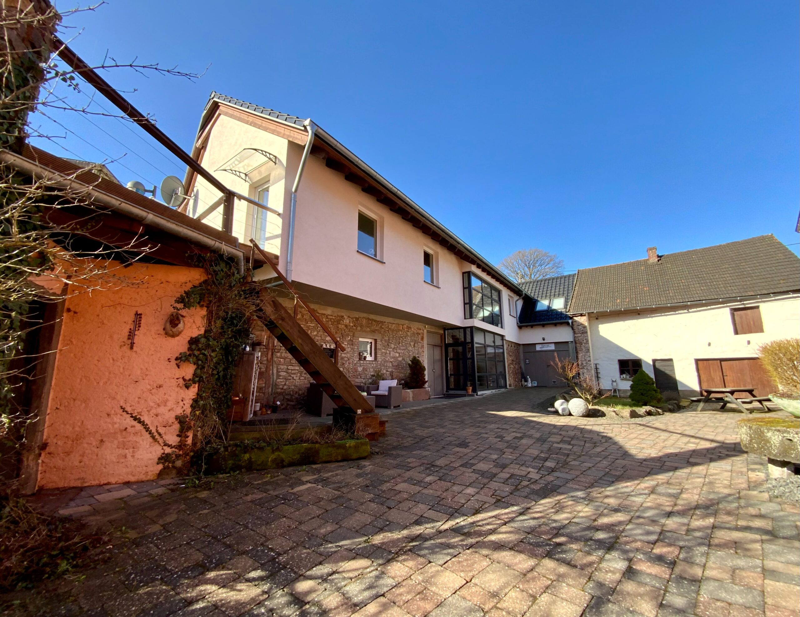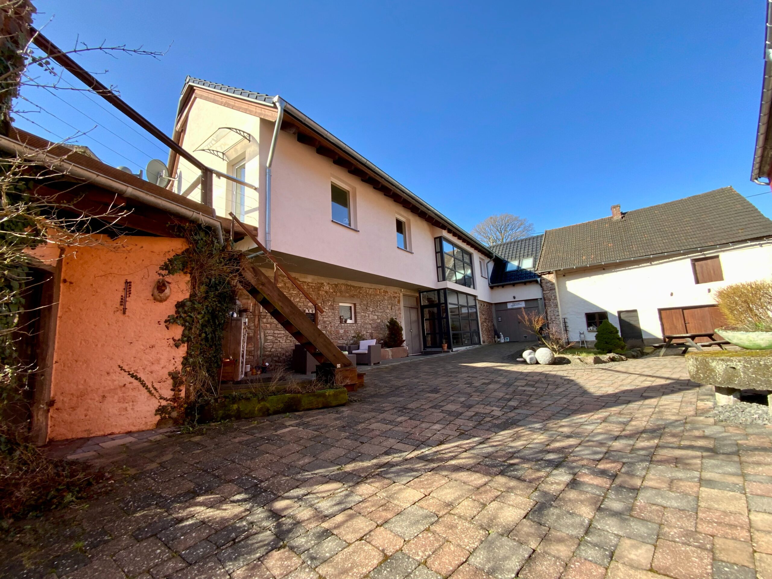 Kleinod – große ehemalige Hofstelle mit Innenhof aus dem 17. Jhd., wovon die Scheune komplett saniert und in 2 Luxus-Ferienhäuser umgebaut wurde. Separates Wohnhaus plus mehrere Nebengebäude und ein Baugrundstück, ruhig gelegen in der Nähe von Gerolstein