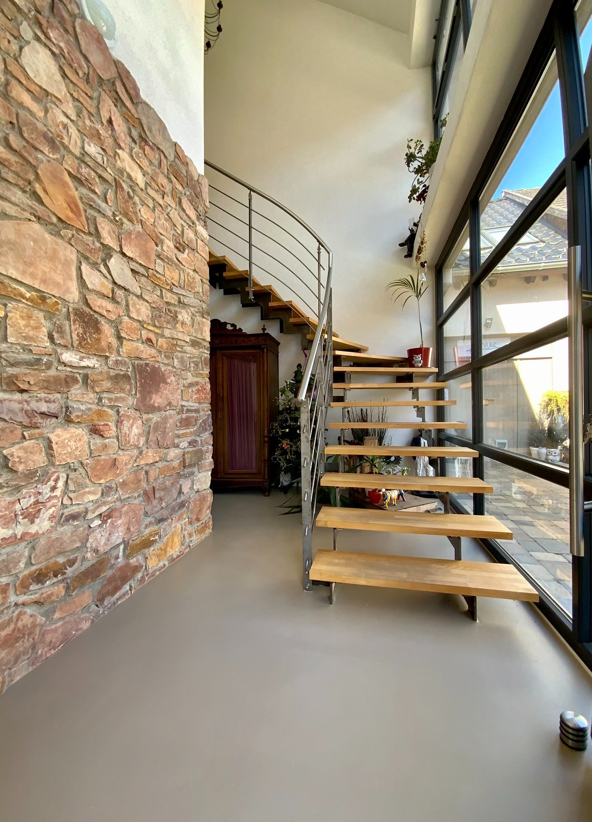 EG ist aufgeteilt in den Flurbereich, das Treppenhaus, Wellnessbereich mit Sauna, Liegebereich, Dusche und Toilette. Über eine moderne Stahltreppe mit Holzbelag und einer großen Glasfront mit Blick auf den Innenhof erreicht man das OG.