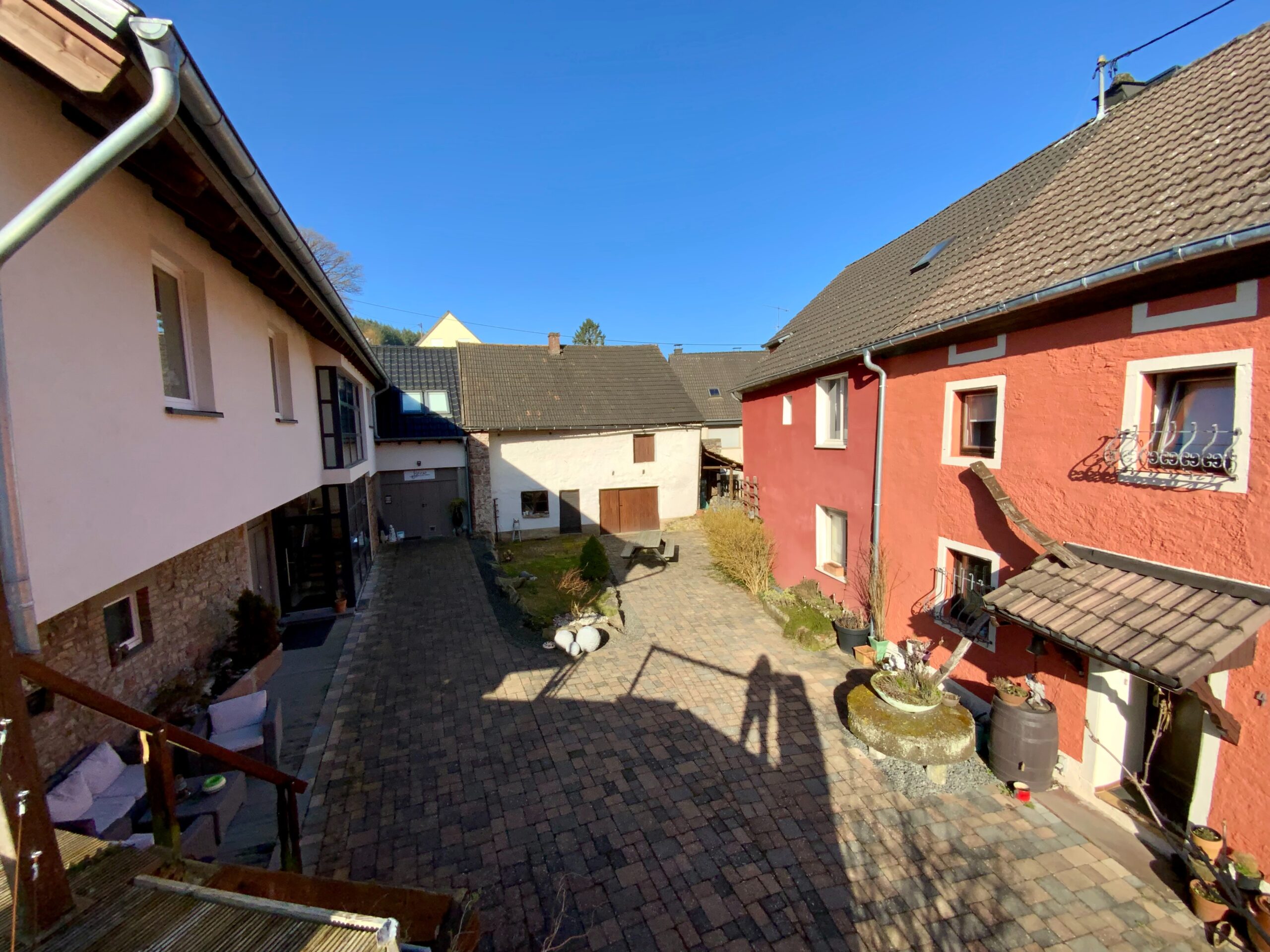 Der Innenhof ist das zentrale Prachtstück vom Objekt. Hier spielt sich das Leben im Frühjahr, Sommer und Herbst ab. Im Innenhof wurden natürliche Materialien verarbeitet die aus dem historischen Objekt stammen. Mehrere Sitzmöglichkeiten mit einem Tisch aus Mühlensteinen, Sandsteinbecken, etc. befinden sich in dem traumhaft schönen Innenhof.