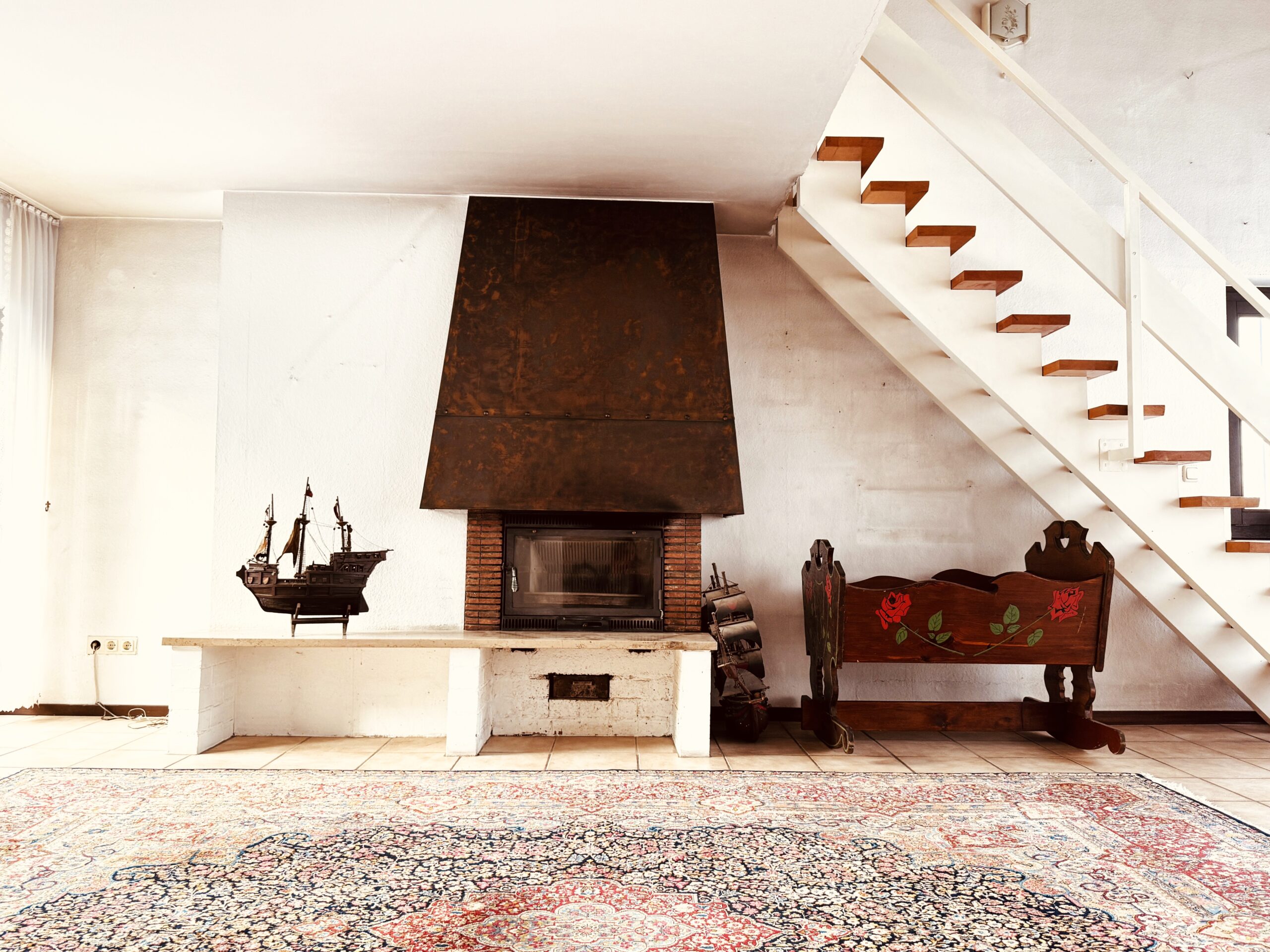 zum Garten. Ein Kamin im offenen Wohnbereich,