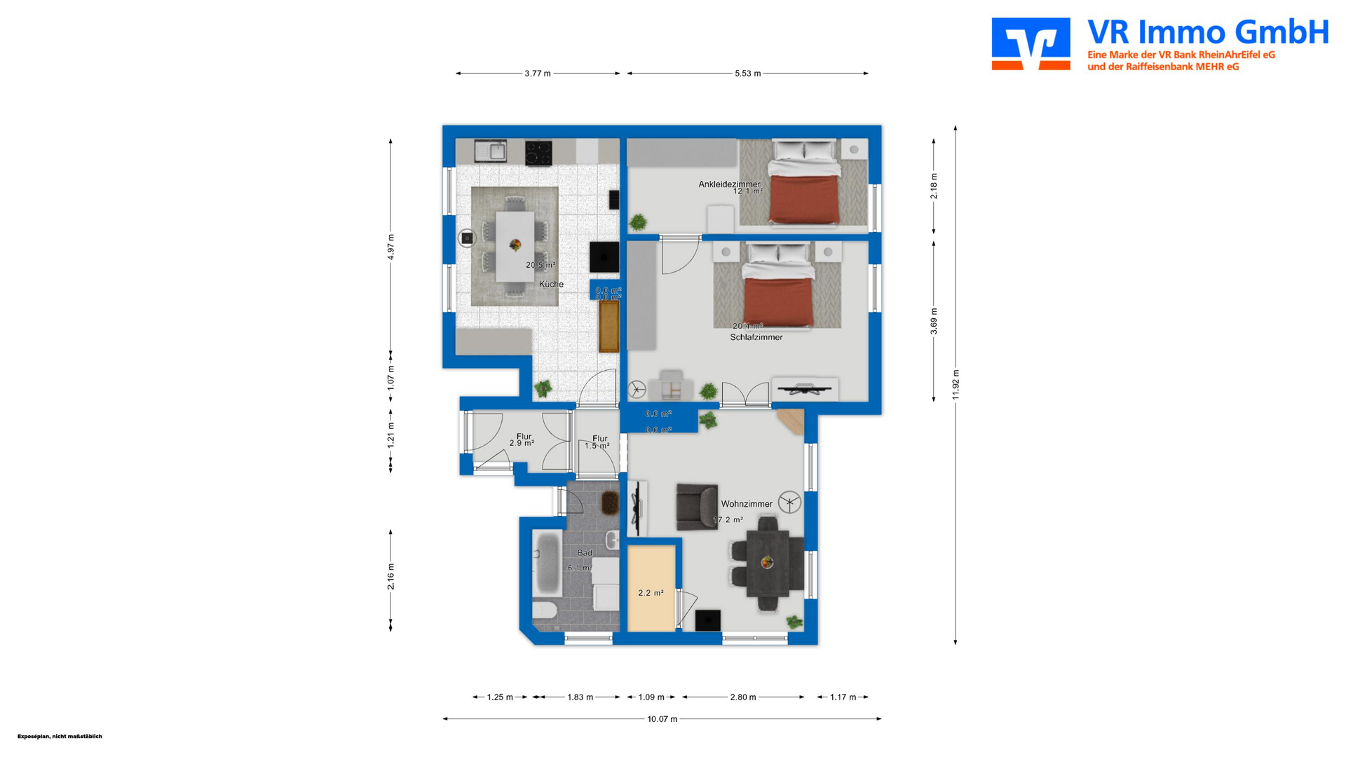 Flur; Küche mit Kaminofen; Wohnzimmer; Schlafzimmer mit angrenzendem Ankleidezimmer; Wannenbad