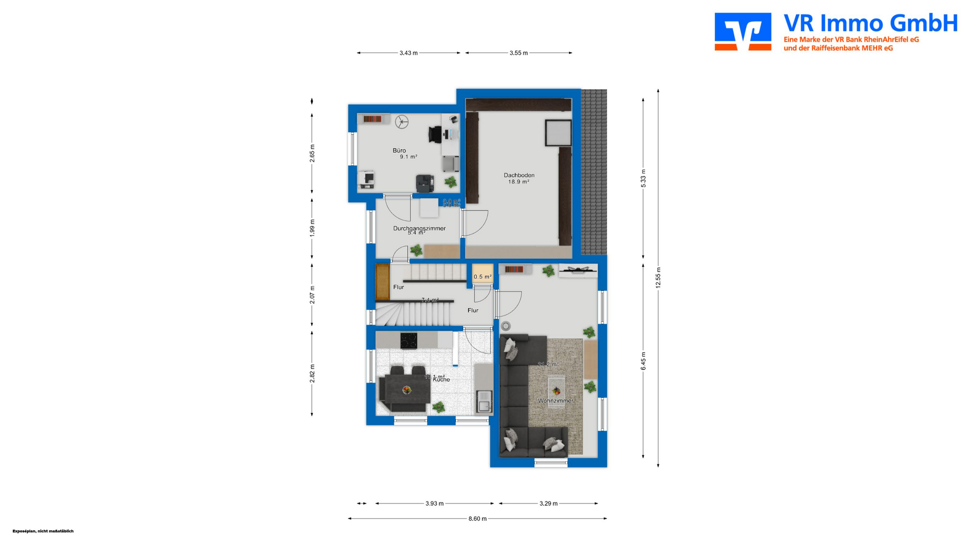 Flur; Wohnküche; Wohnzimmer; Durchgangszimmer/Arbeitszimmer und angrenzendem Dachboden