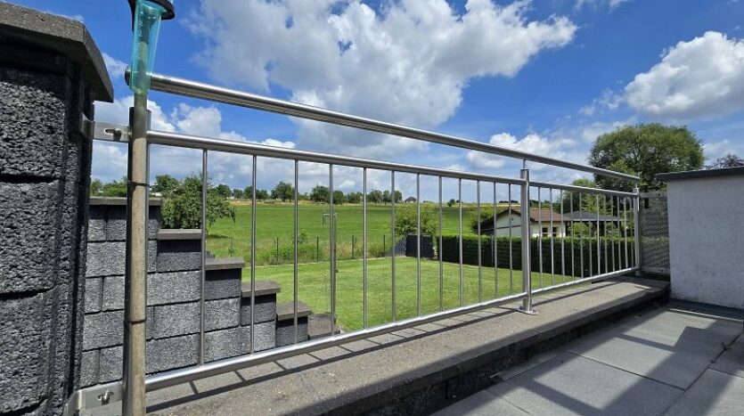 Zwischen Wohnhaus und Garage führt eine Treppe zur ca. 82 m² großen Einliegerwohnung. Die Wohnung verfügt über zwei Schlafzimmer, ein Tageslichtbad mit Dusche und Badewanne, ein Hauswirtschafts- und Stauraum und einen sehr geräumigen Wohn- und Essbereich mit offener Küche inklusive Einbauküche. Von hier aus gelangt man stufenlos auf die große Außenterrasse.