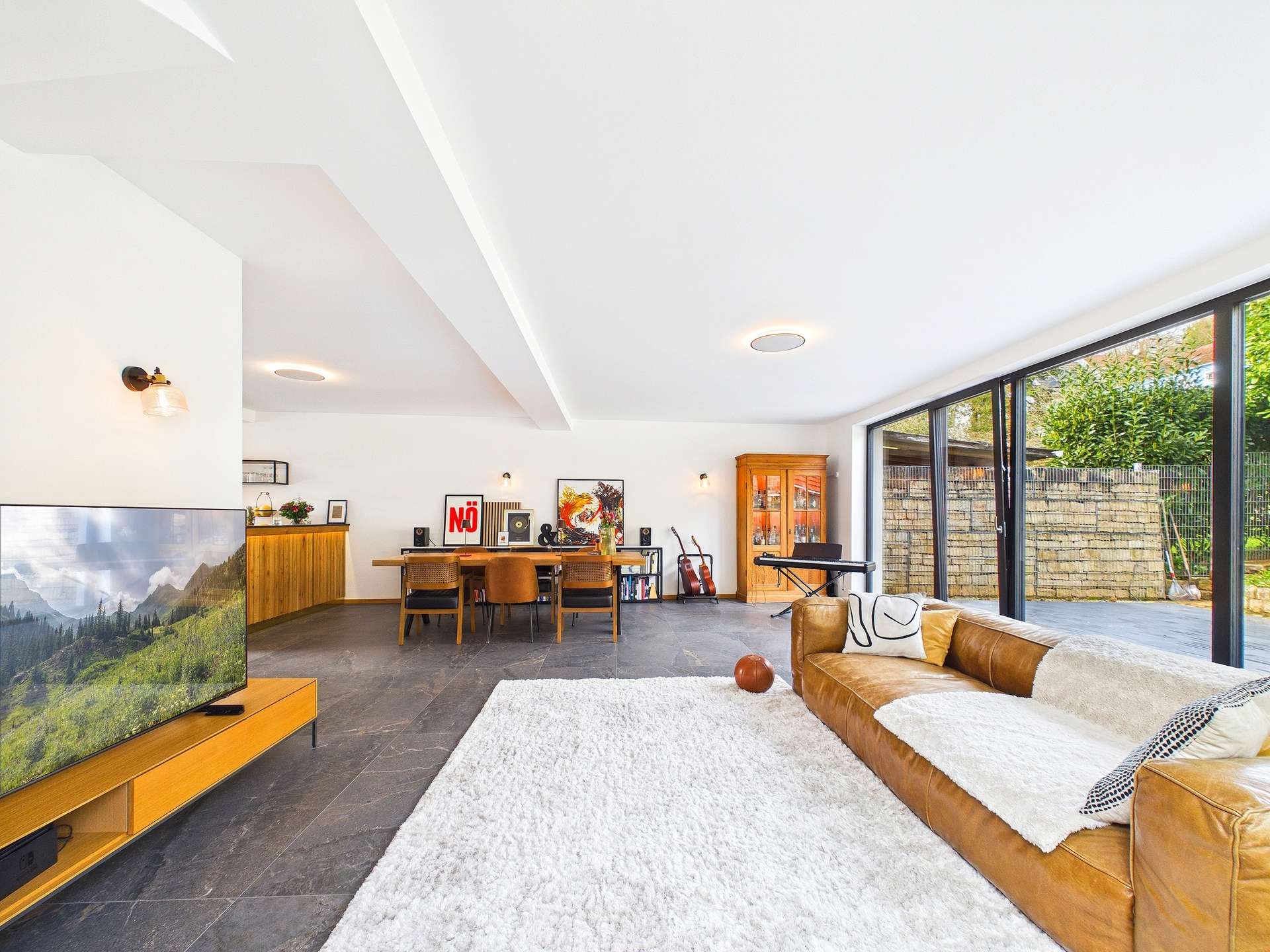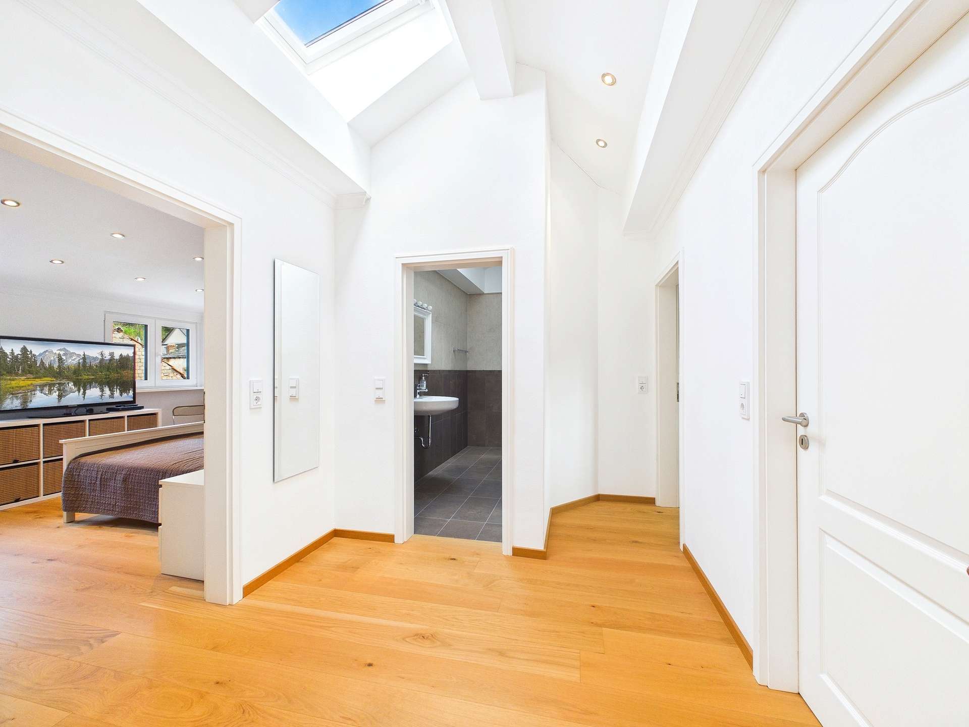Im ersten Obergeschoss öffnet sich der Blick auf die hochwertig gestaltete Hauptwohnung. Ein großzügiger Wohn und Essbereich mit integrierter Küche bildet den Mittelpunkt dieses Zuhauses und schafft mit seiner Offenheit und Eleganz eine Atmosphäre, in der man sich sofort angekommen fühlt. Der angrenzende Wintergarten erweitert den Wohnraum auf besonders schöne Weise und sorgt für ein lichtdurchflutetes Ambiente mit ganz besonderem Charme. Auf dieser Ebene befinden sich außerdem ein Büro, ein Gäste WC, ein offen gestaltetes Schlafzimmer mit Ankleide, das Elternbad sowie ein Hauswirtschaftsraum. So verbindet sich stilvoller Wohnkomfort mit einer durchdachten Alltagstauglichkeit.