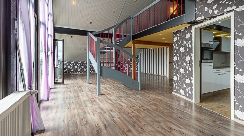 Ruime hal, open woon-/eetkamer met toegang tot het balkon en trap naar de galerij (slaapgedeelte), slaapkamer met uitgang, keuken, badkamer met dubbele wastafel/hoekbad/douche/twee ramen, apart toilet in de badkamer