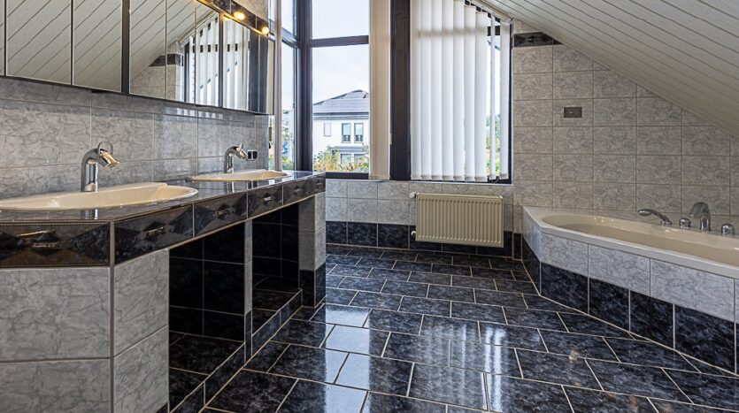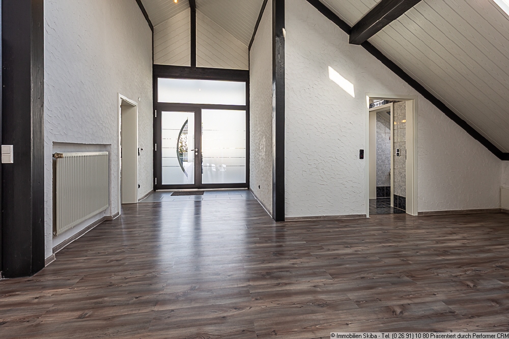 große Diele, nach oben offener Wohn-/Essbereich mit Balkonzugang und Aufgang zur Empore (Schlafbereich), Schlafzimmer mit Ausgang, Küche, Badezimmer mit Doppel-Waschbecken/Eck-Badewanne/Dusche/zwei Fenster, separates WC im Badezimmer