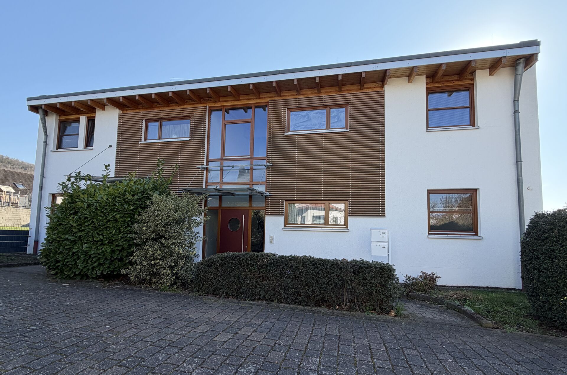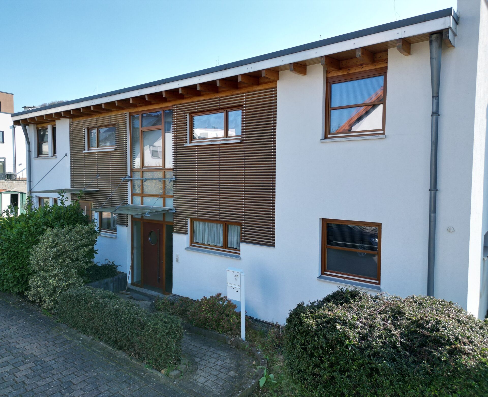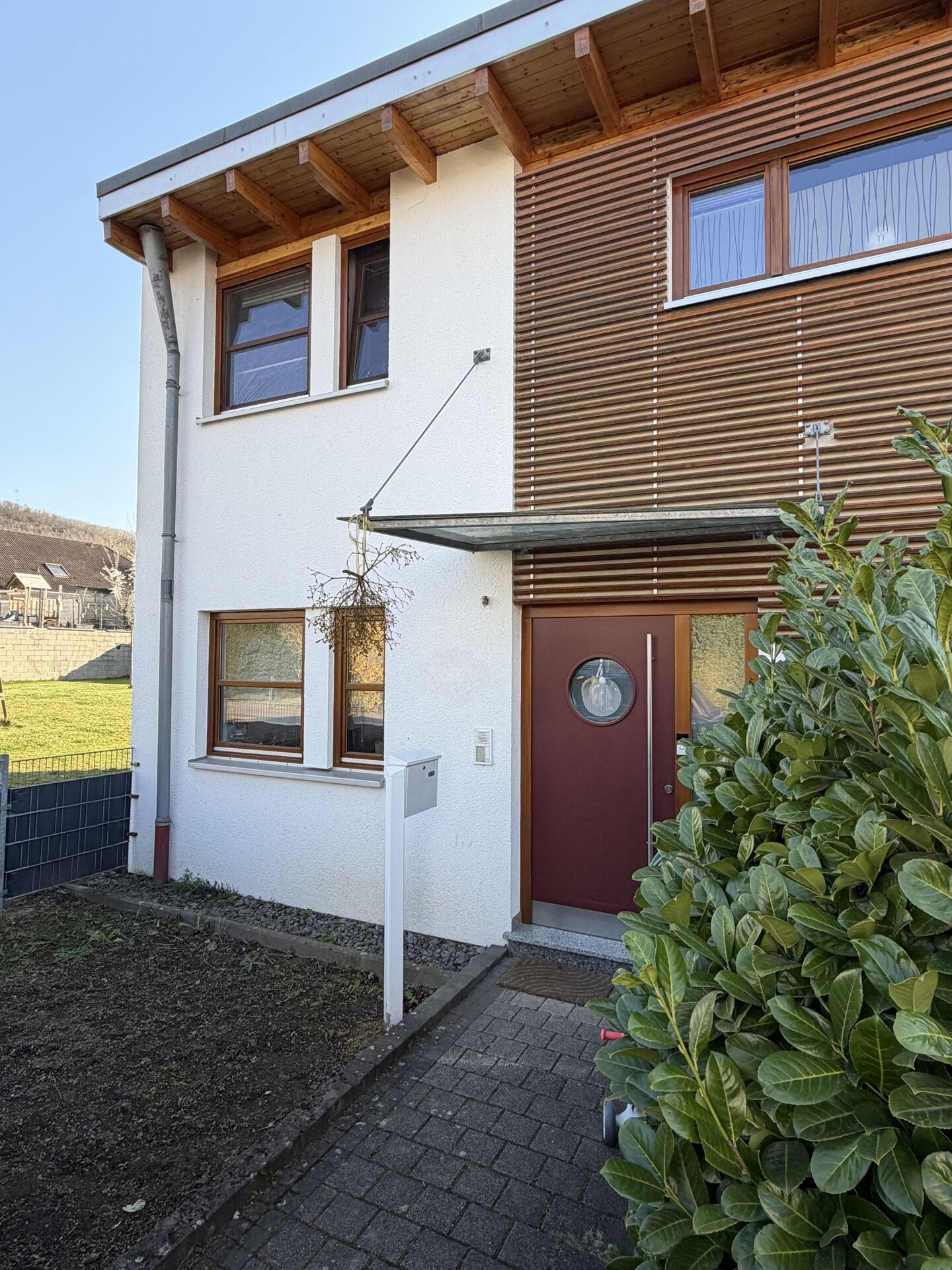 massiv, verputzt und gestrichen, Echthholzverkleidung an der Hausfront