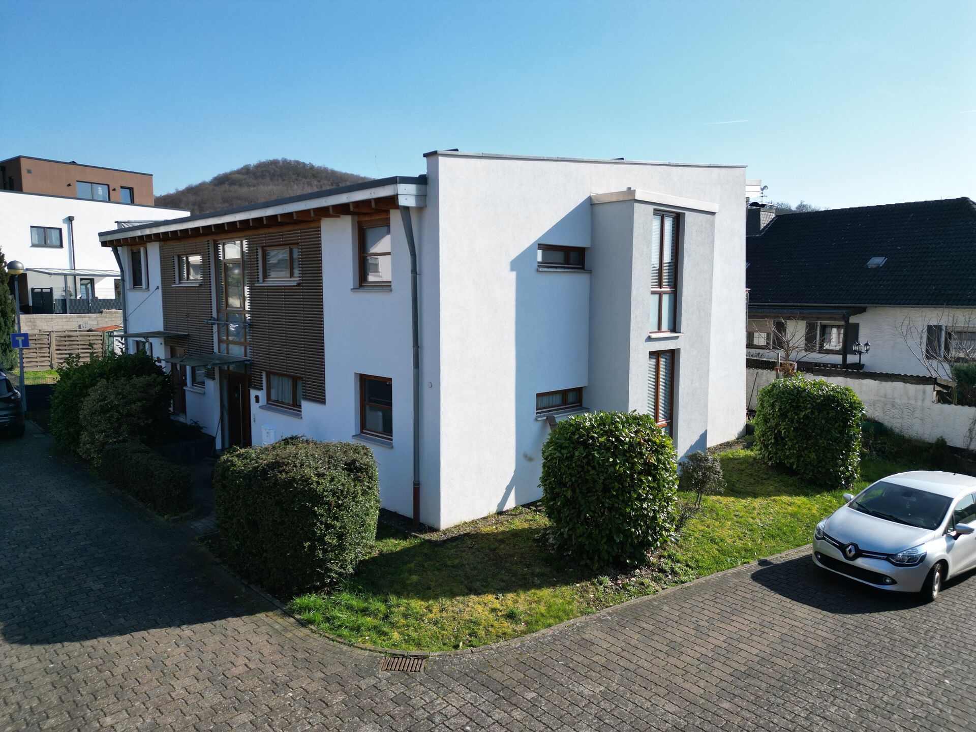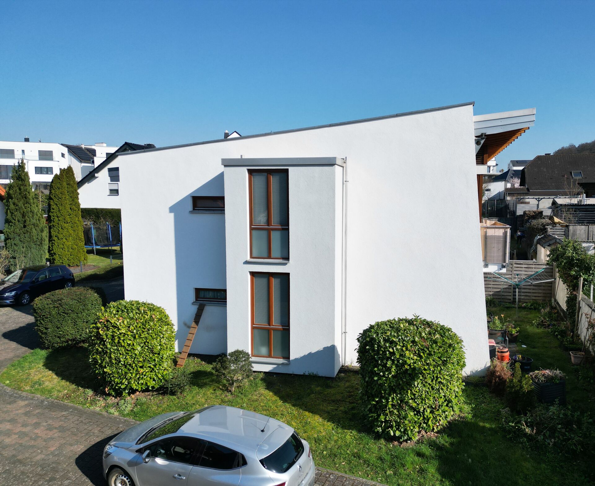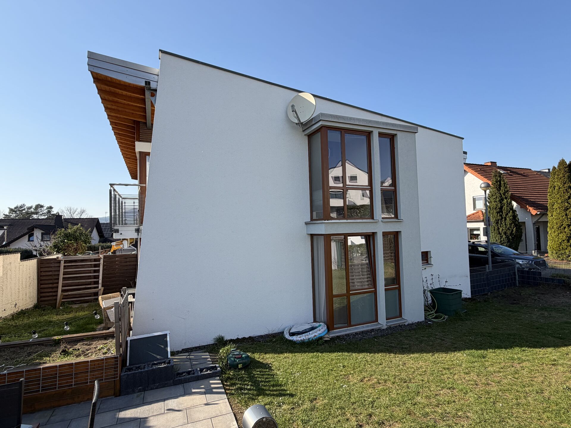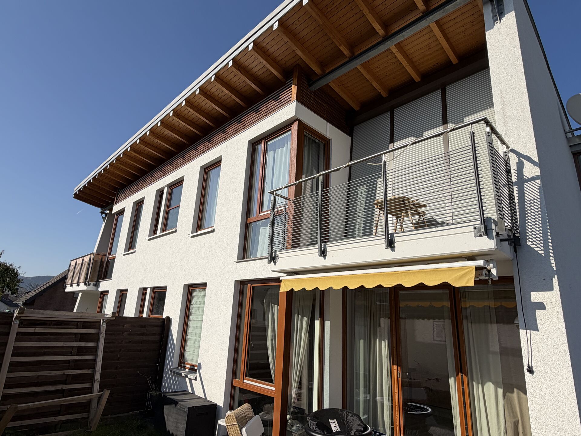 Die Liegenschaft erstreckt sich auf einem ca. 733 m² großen Grundstück und überzeugt durch eine sehr gepflegte Ausstattung sowie architektonische Highlights wie eine Sichtbalkendecke im Obergeschoss sowie eine hochwertige Holzverkleidung an der Front der Fassade.