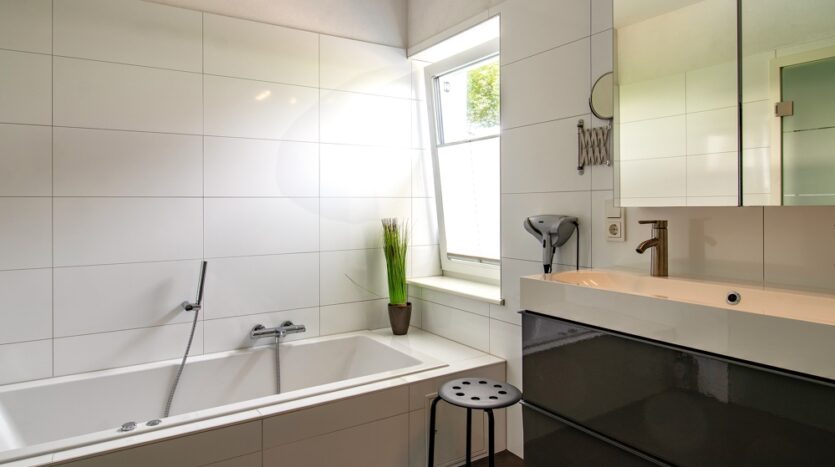 – Ein Bad mit bodenebener Dusche sowie Badewanne mit Whirlpool liegt gut erreichbar zwischen zwei Schlafzimmern.