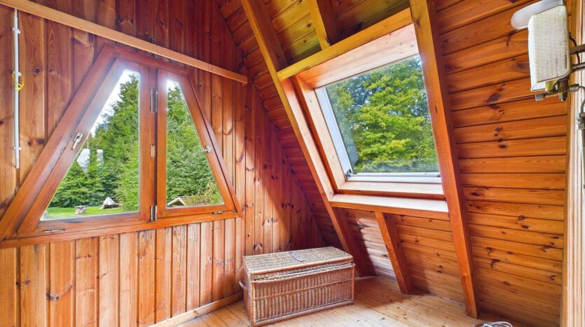 Das Obergeschoss umfasst ein Schlafzimmer sowie ein weiteres Zimmer, das sich ideal als Ankleide oder zweites Schlafzimmer nutzen lässt. Durch die Dachschrägen entsteht eine besonders behagliche Atmosphäre – morgens mit dem Blick ins Grüne erwachen, abends unter funkelndem Sternenhimmel einschlafen.