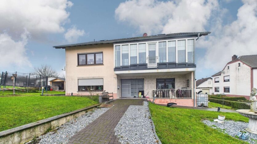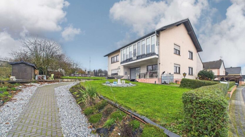 Im idyllischen Schleid bei Bitburg steht dieses eindrucksvolle Zweifamilienhaus zum Verkauf – ein Zuhause mit Charakter, Großzügigkeit und einer Atmosphäre, die sofort ein Gefühl von Ankommen vermittelt. Das massiv erbaute Wohnhaus aus dem Jahr 1976 wurde zwischen 2019 und 2021 umfassend und mit viel Sorgfalt renoviert, sodass es heute in einem modernen und gepflegten Gesamtzustand erstrahlt. Insgesamt bietet die Immobilie ca. 340 m² Wohnfläche und rund 123 m² Nutzfläche auf einem 914 m² großen Grundstück, das genügend Raum für Rückzug, Freizeit und Entfaltung lässt. Ein Carport für zwei Fahrzeuge sowie ein zusätzlicher Außenstellplatz runden das Angebot ab. Der Zugang erfolgt entweder über einen gepflasterten, ebenerdigen Weg oder alternativ über zwei Stufen.