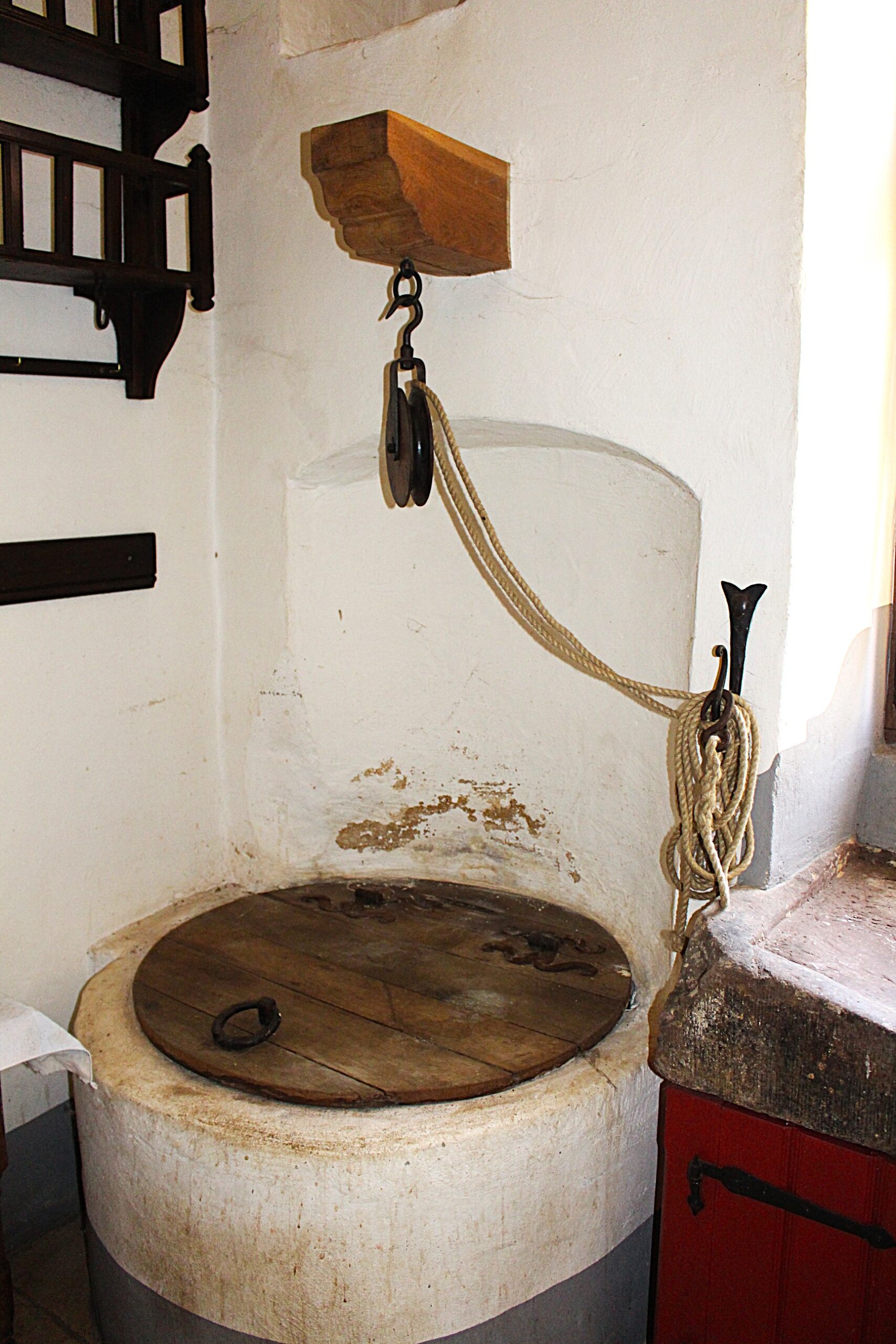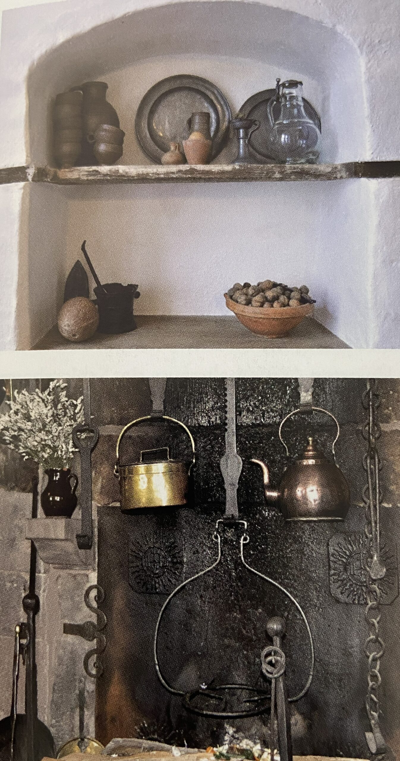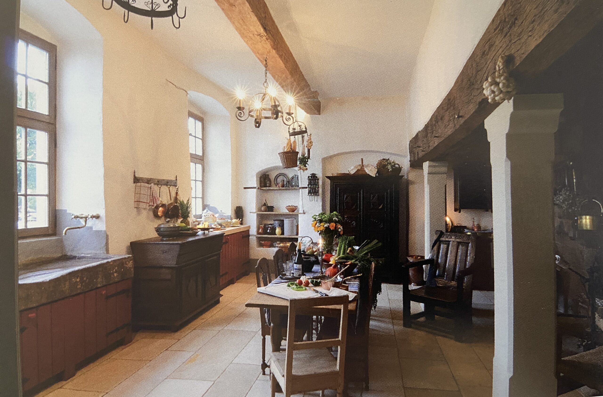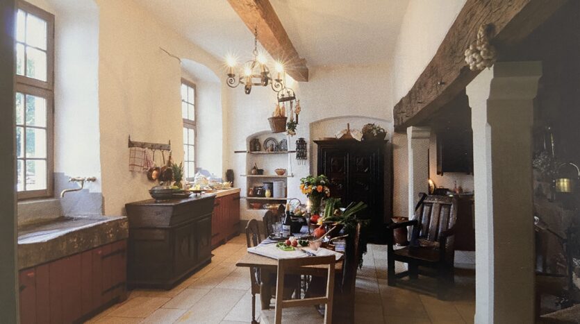 De keuken (1605) is bijna volledig bewaard gebleven… een zes meter lange schouw met een gewelfde schoorsteen, een oven, een bakstenen “potager” (keukentje), nissen en een waterput.