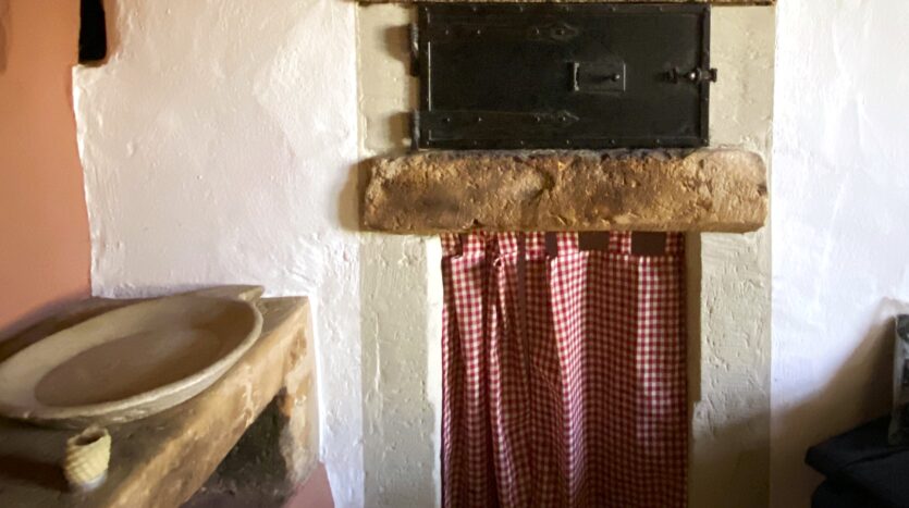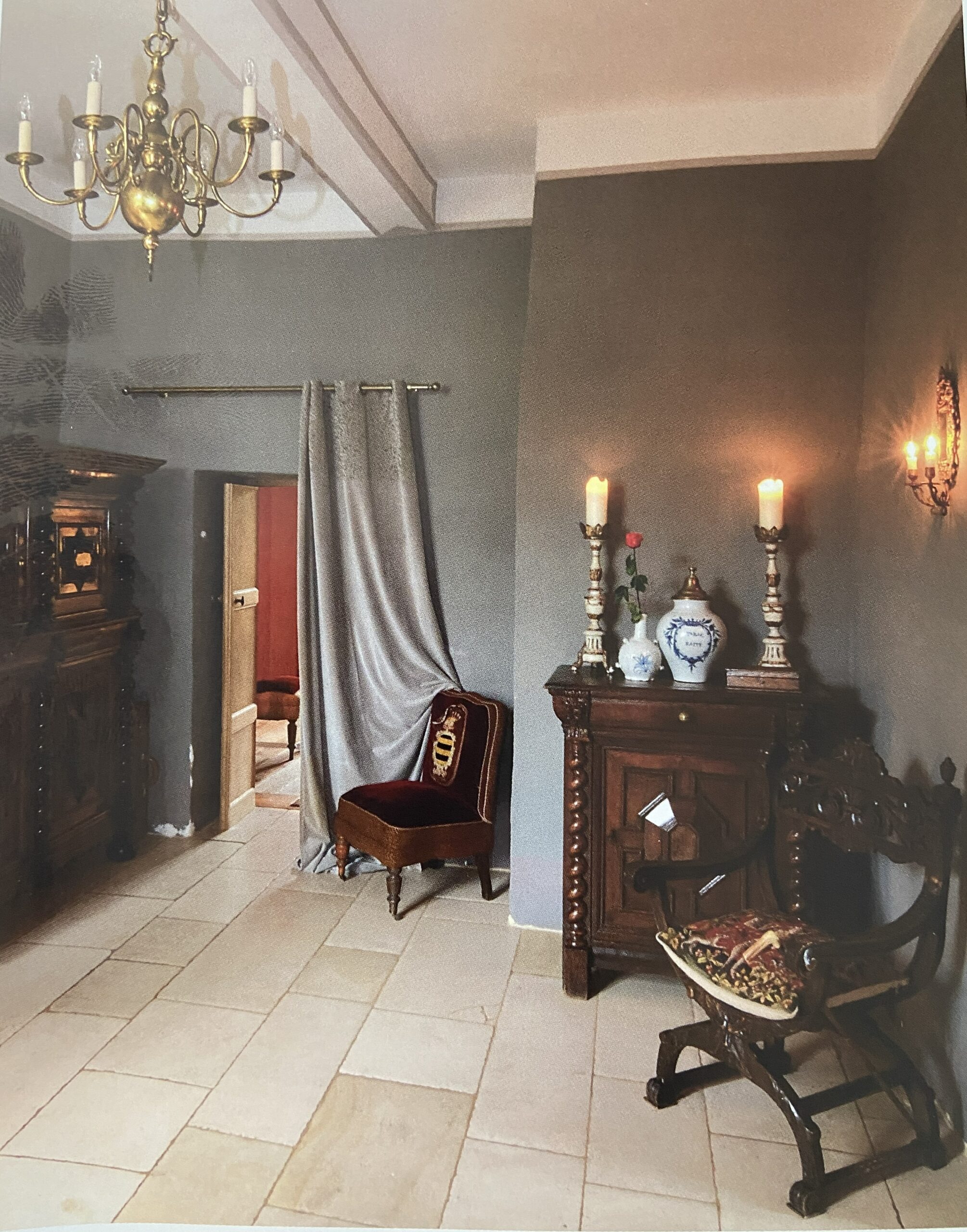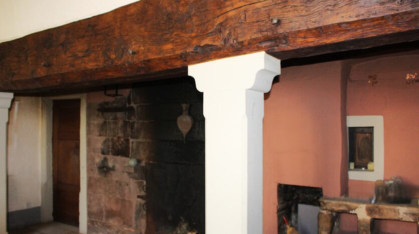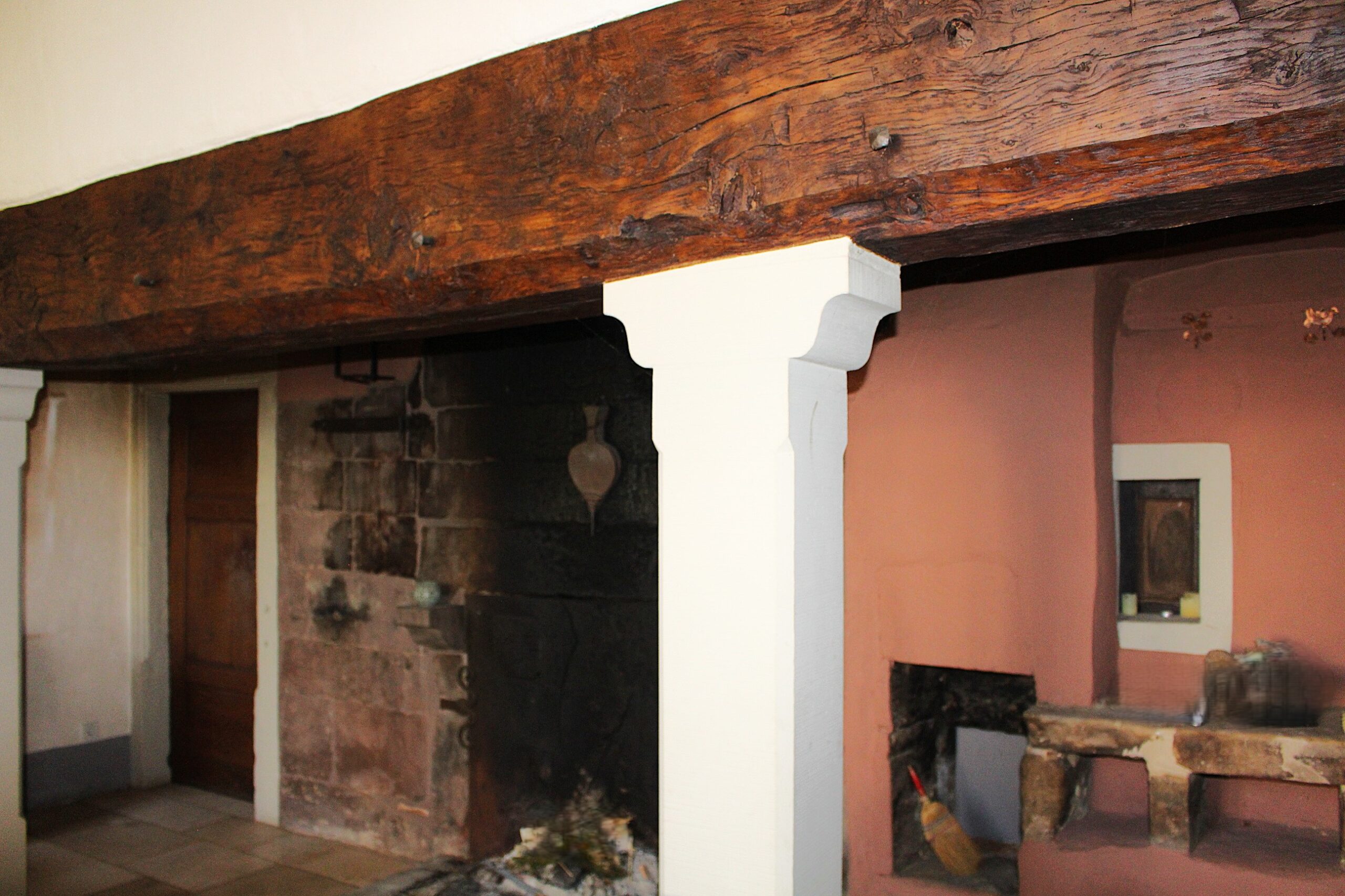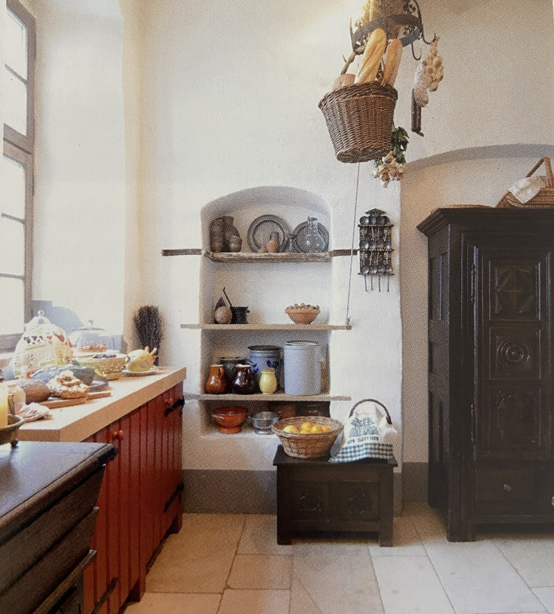 De keuken (1605) is bijna volledig bewaard gebleven… een zes meter lange schouw met een gewelfde schoorsteen, een oven, een bakstenen “potager” (keukentje), nissen en een waterput.