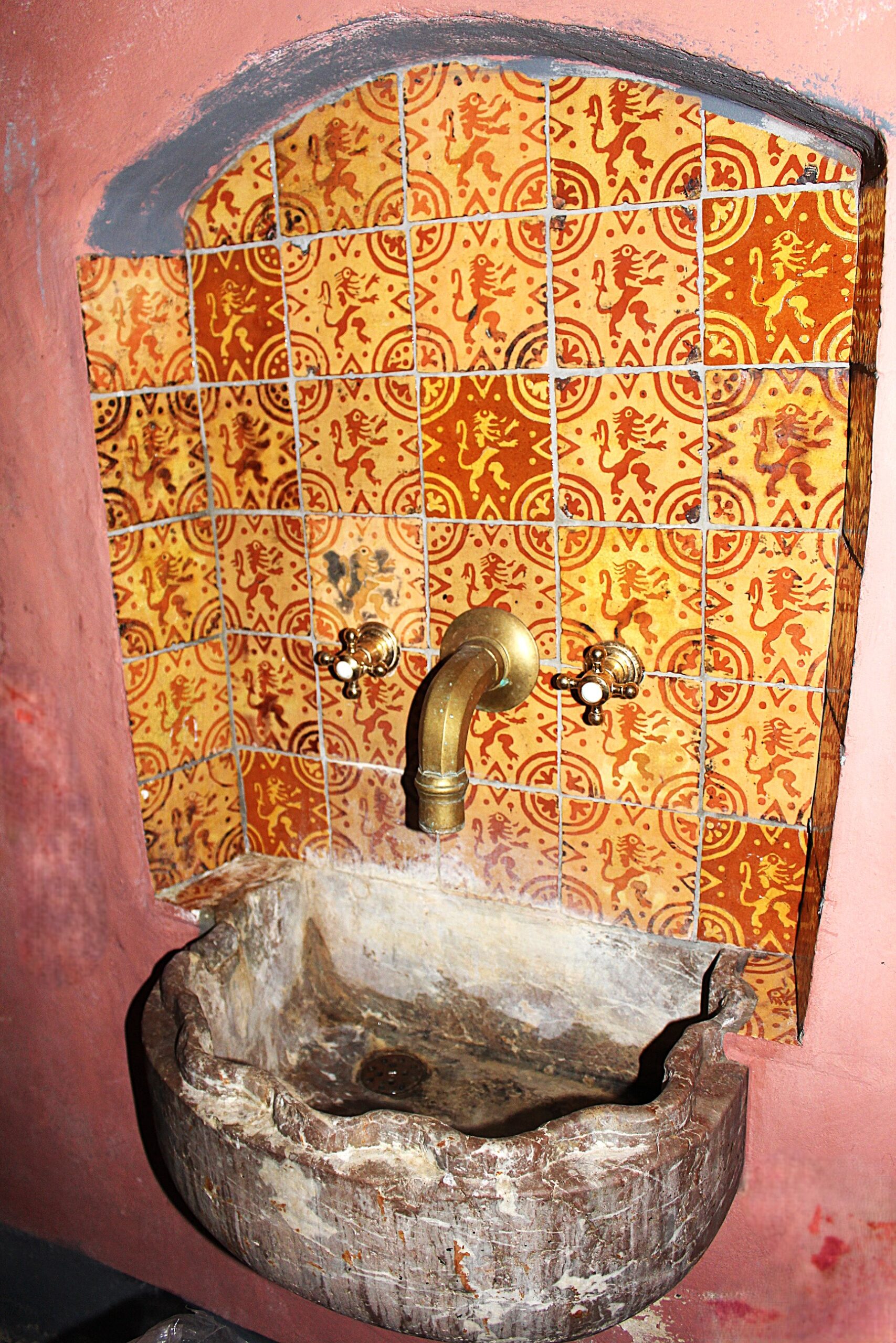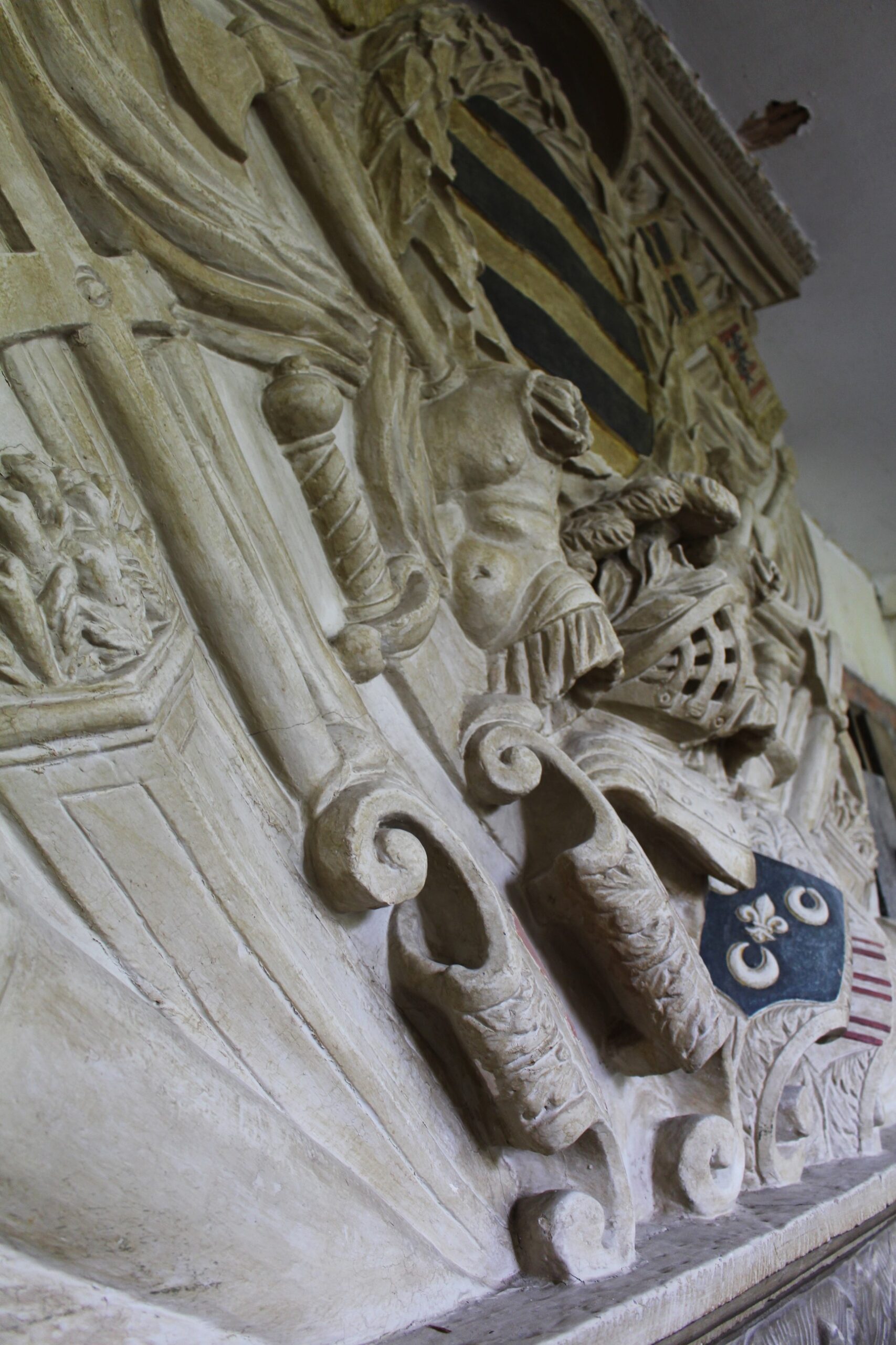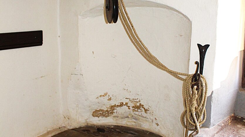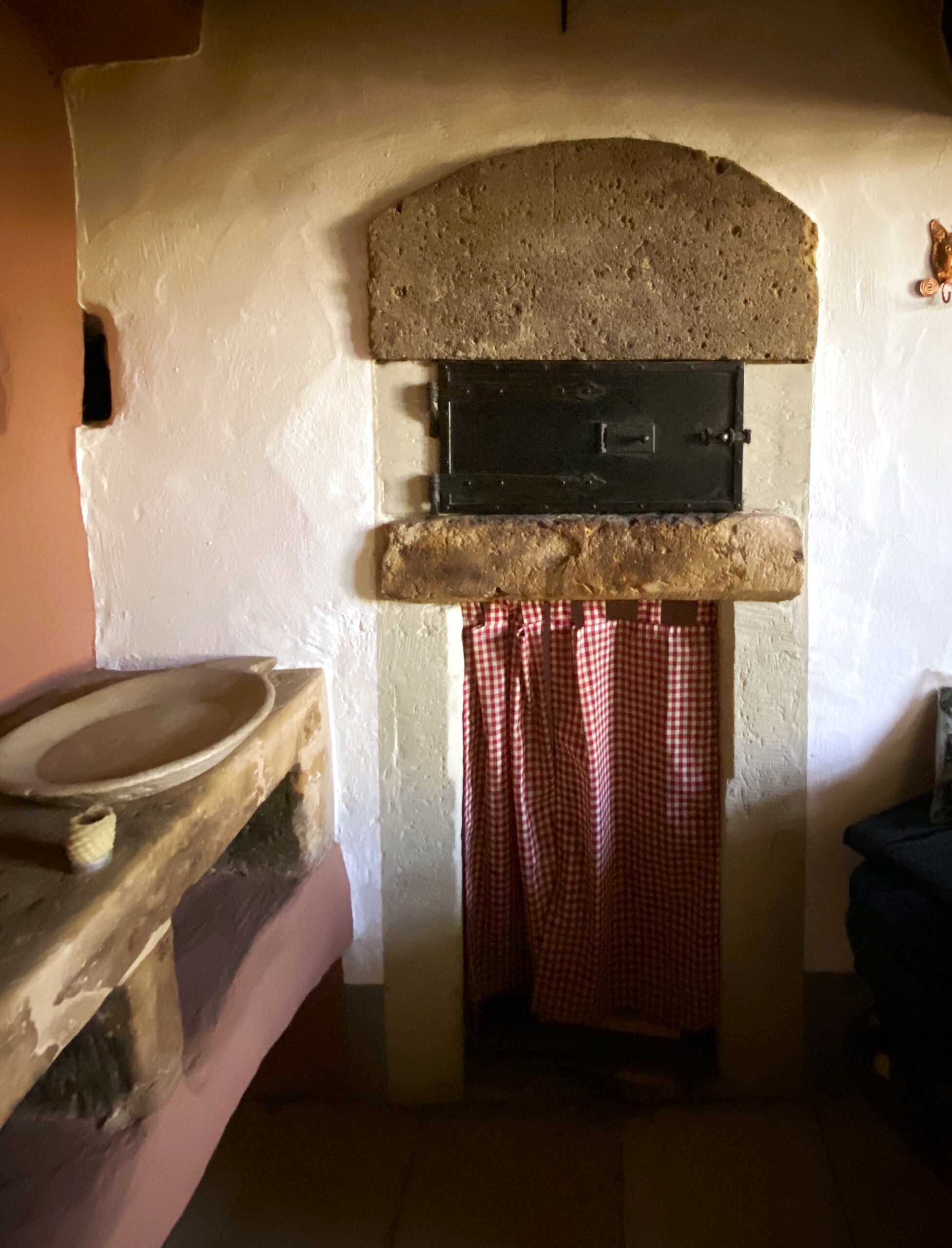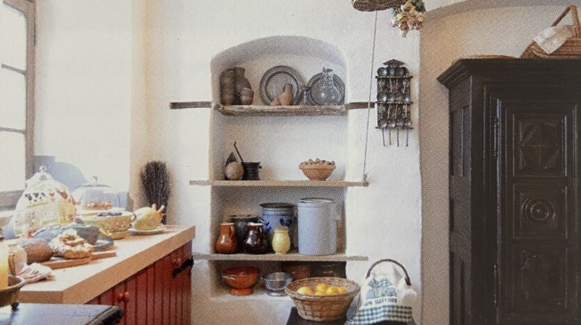 De keuken (1605) is bijna volledig bewaard gebleven… een zes meter lange schouw met een gewelfde schoorsteen, een oven, een bakstenen “potager” (keukentje), nissen en een waterput.