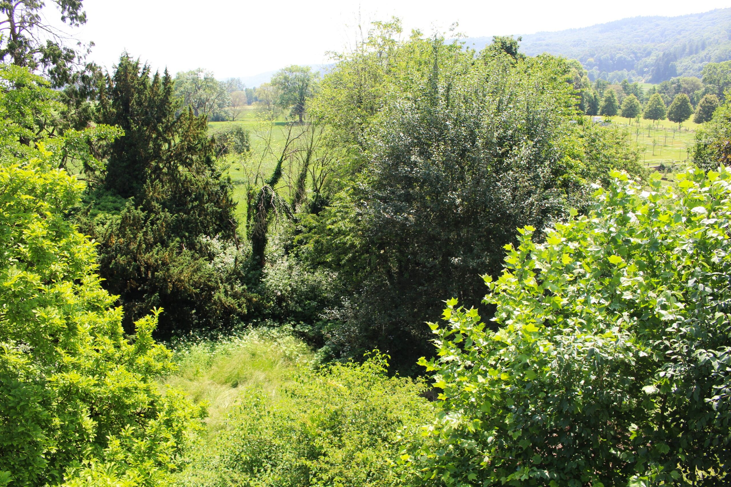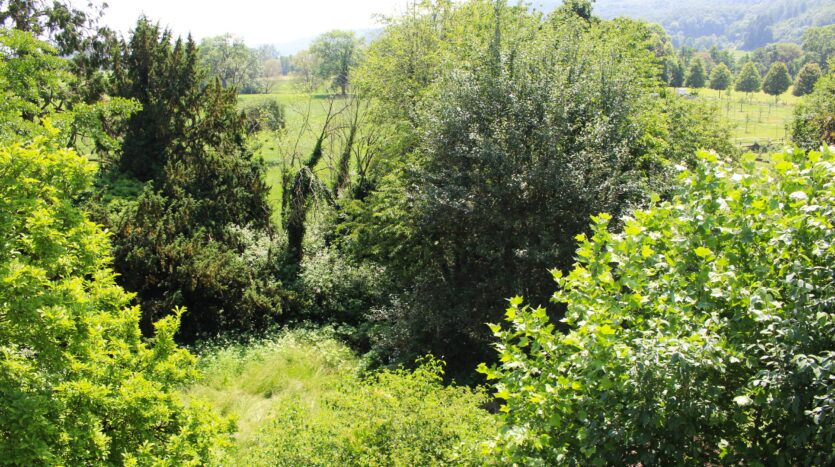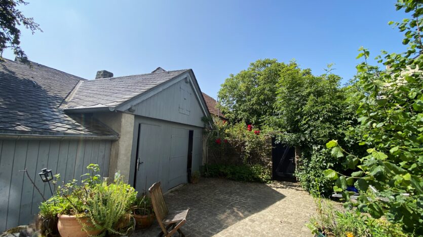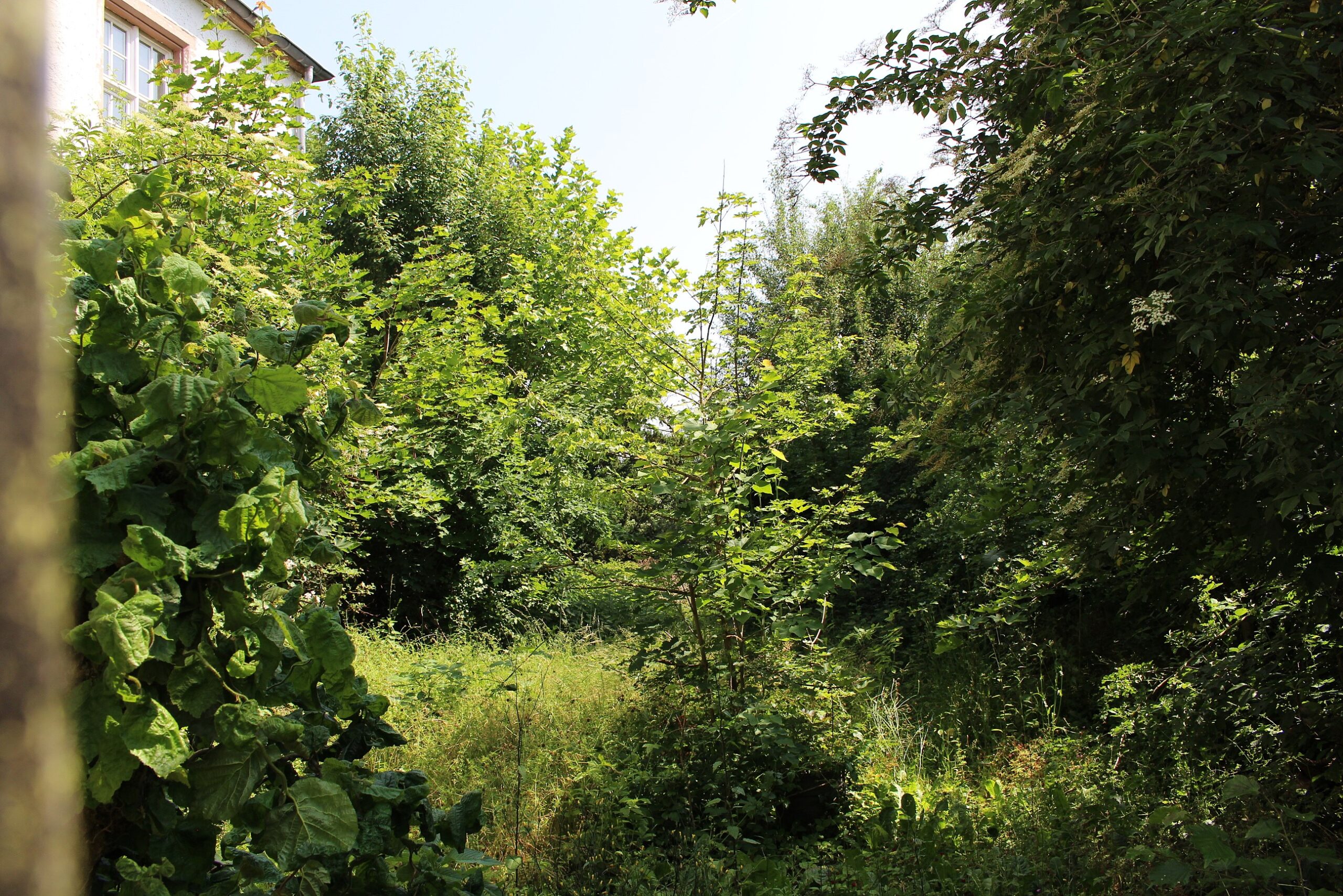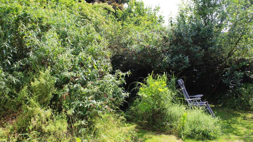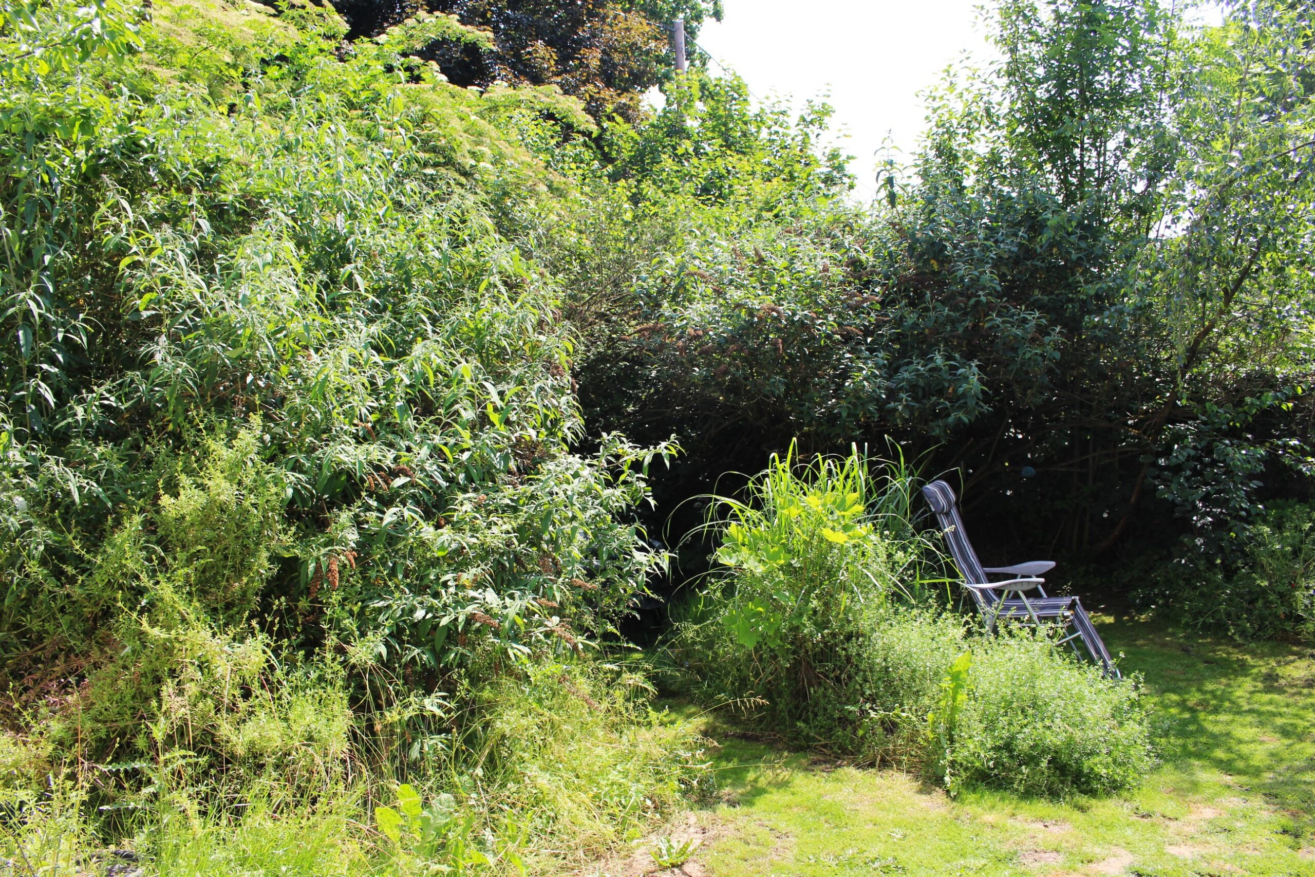 De tuin heeft wat aandacht nodig, maar ontpopt zich dan tot een sprookjesachtige tuin, zonder inkijk, met wat verkoelende schaduw en tegelijkertijd zonnige plekjes, die een rustige winterhoek bieden, evenals het grotere plaatje van de weide met toegang tot de prachtige open haard.