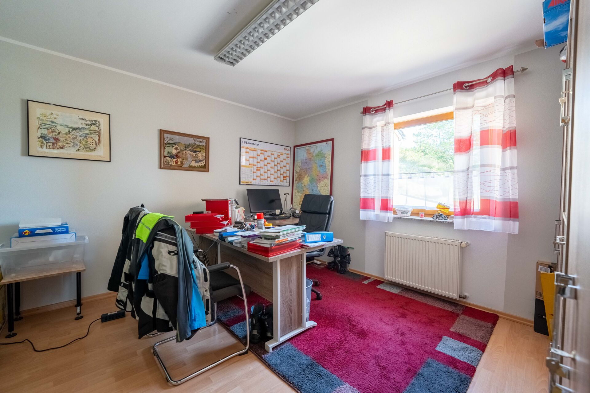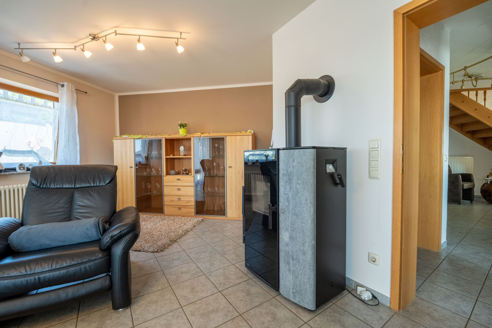Diele; Arbeitszimmer; Wannen-/Duschbad; Schlafzimmer; Wohnzimmer mit Zugang zur großzügigen Terrasse und Kaminofen; Wohnküche mit angrenzenden Spind; Gäste-WC