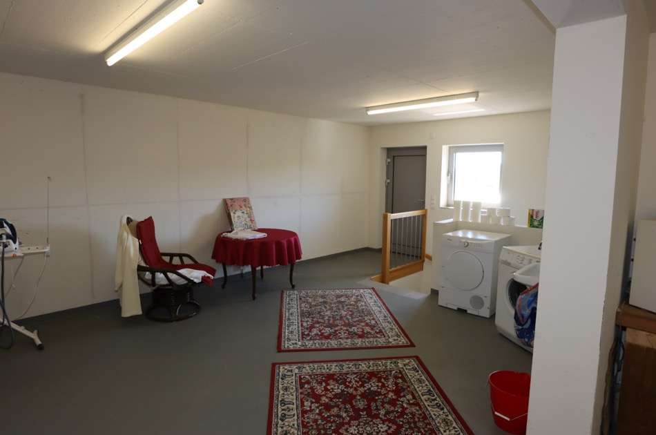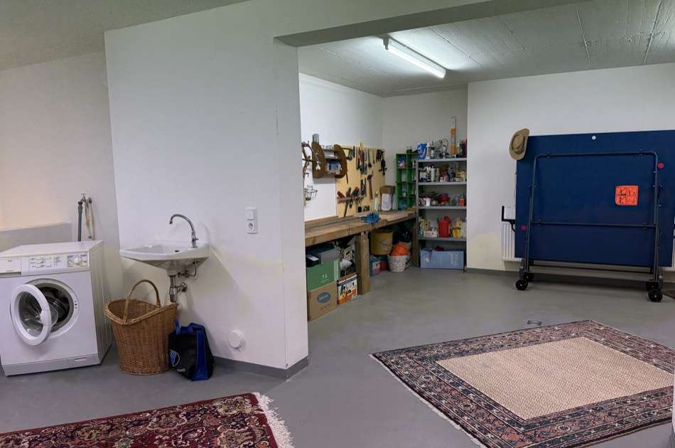 Untergeschoss 2: Flur mit Zugang zum Aufzug, großer Hauswirtschaftsraum mit Werkstatt, Heizungsraum, kleiner Freisitz (nicht in Benutzung), Treppe zur Garage.