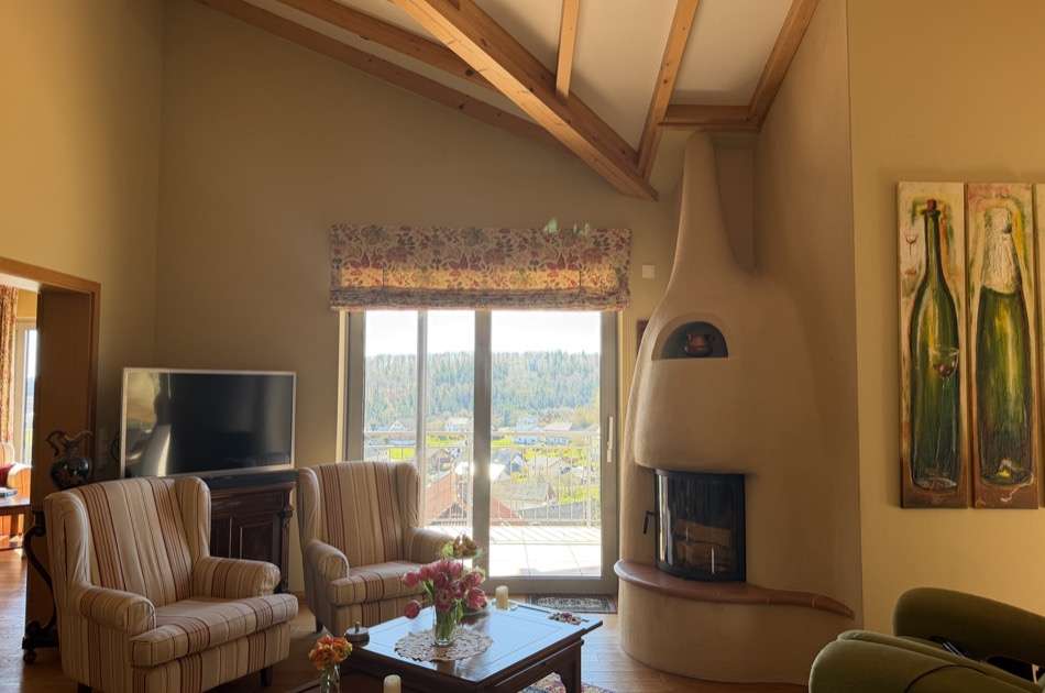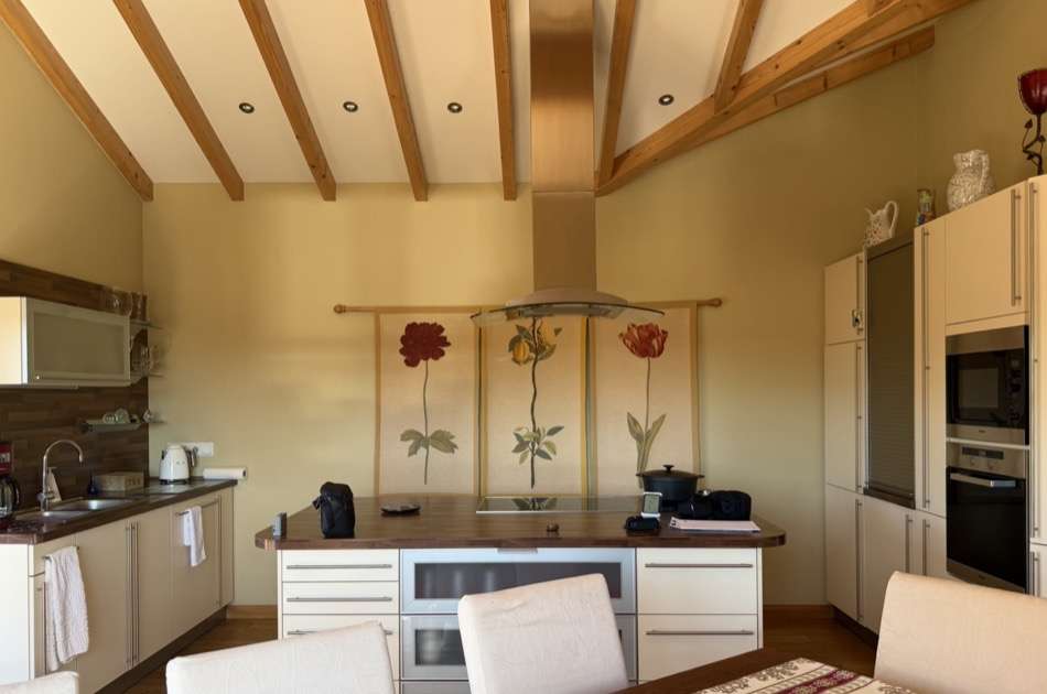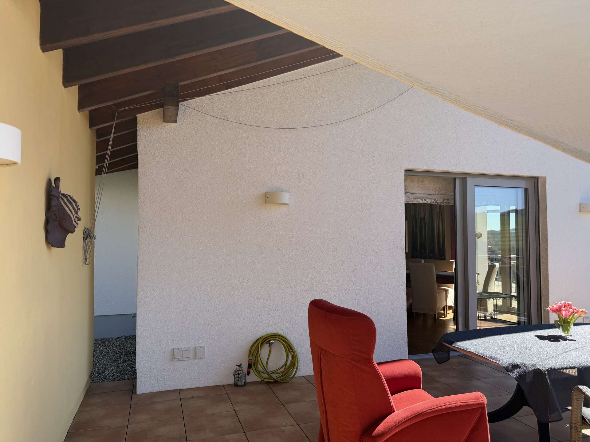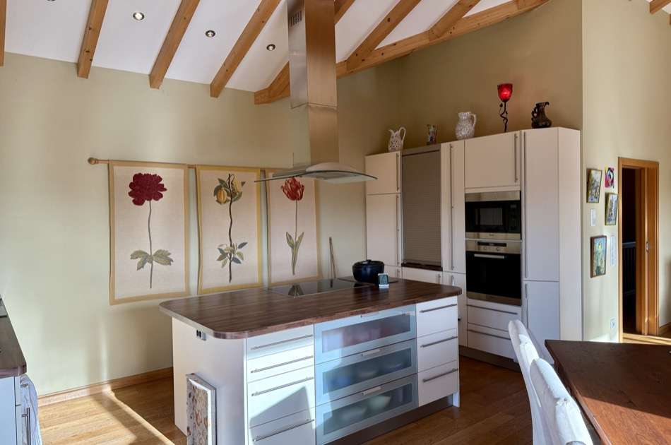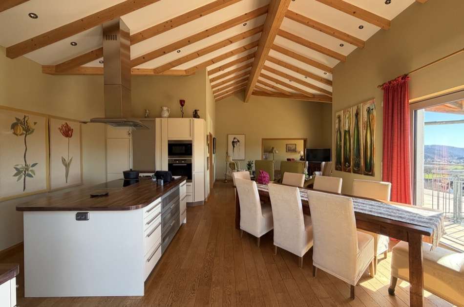 Erdgeschoss: Eingang, Flur mit Zugang zum Aufzug, Garderobe, G-WC, helles offenes Esszimmer mit Kaminecke mit Zugang zum Südbalkon und zur Sonnenterrasse, offene Küche, geräumiges Wohnzimmer mit Zugang zum Südbalkon und zum Büro (potenzielles Schlafzimmer), Treppe ins Untergeschoss.