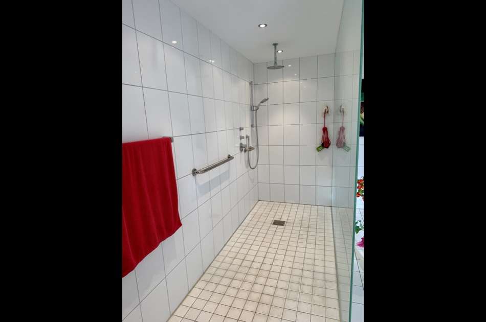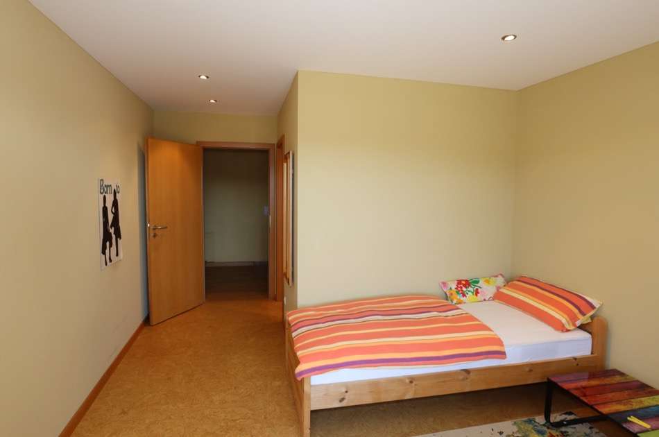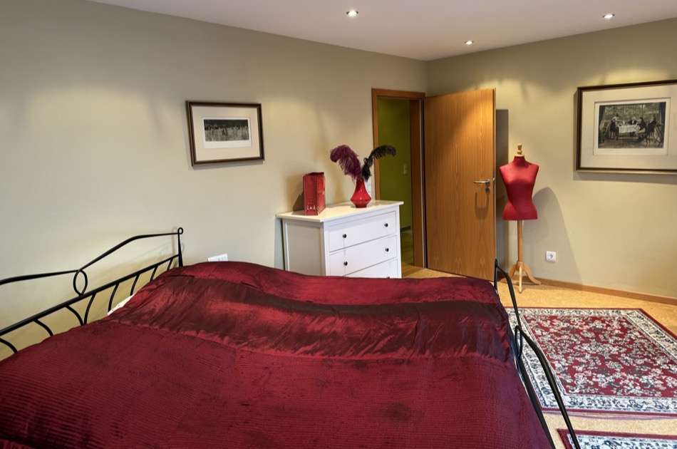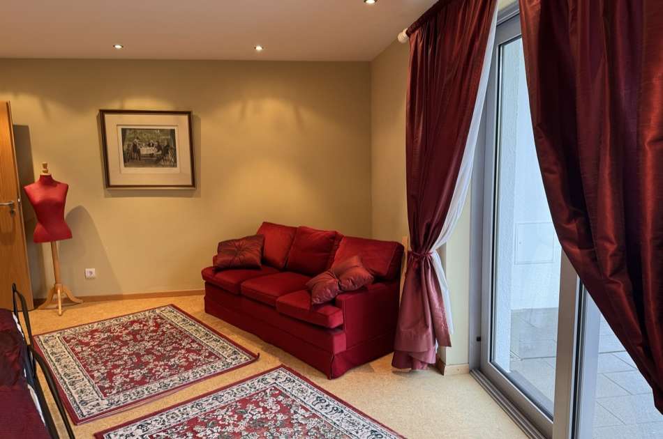 Untergeschoss 1: Flur mit Zugang zum Aufzug, 2 Schlafzimmer mit en suite Duschbad, 1 Schlafzimmer mit großem en suite Badezimmer mit Badewanne, großer barrierefreier Dusche, Bidet und WC, Ankleidezimmer. Zwei Schlafzimmer verfügen über Zugang zur Südterrasse, eines zum Südbalkon. Treppe zum Untergeschoss 2.