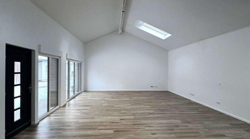 Dieser moderne Bungalow bietet auf rund 95 m² Wohnfläche ein stimmiges Wohnkonzept mit klaren Linien und einer angenehmen Großzügigkeit. Die Wohneinheit liegt in einem gepflegten Ensemble mit nur sechs Einheiten und verfügt über einen eigenen Eingang. Beim Betreten öffnet sich der helle Wohn- und Essbereich mit offener Küche, der durch seine bis in den Giebel offene Decke ein beeindruckendes Raumgefühl vermittelt. Eine großzügige Fensterfront sowie zwei Dachfenster lassen viel Tageslicht herein und schaffen eine lichtdurchflutete Atmosphäre.