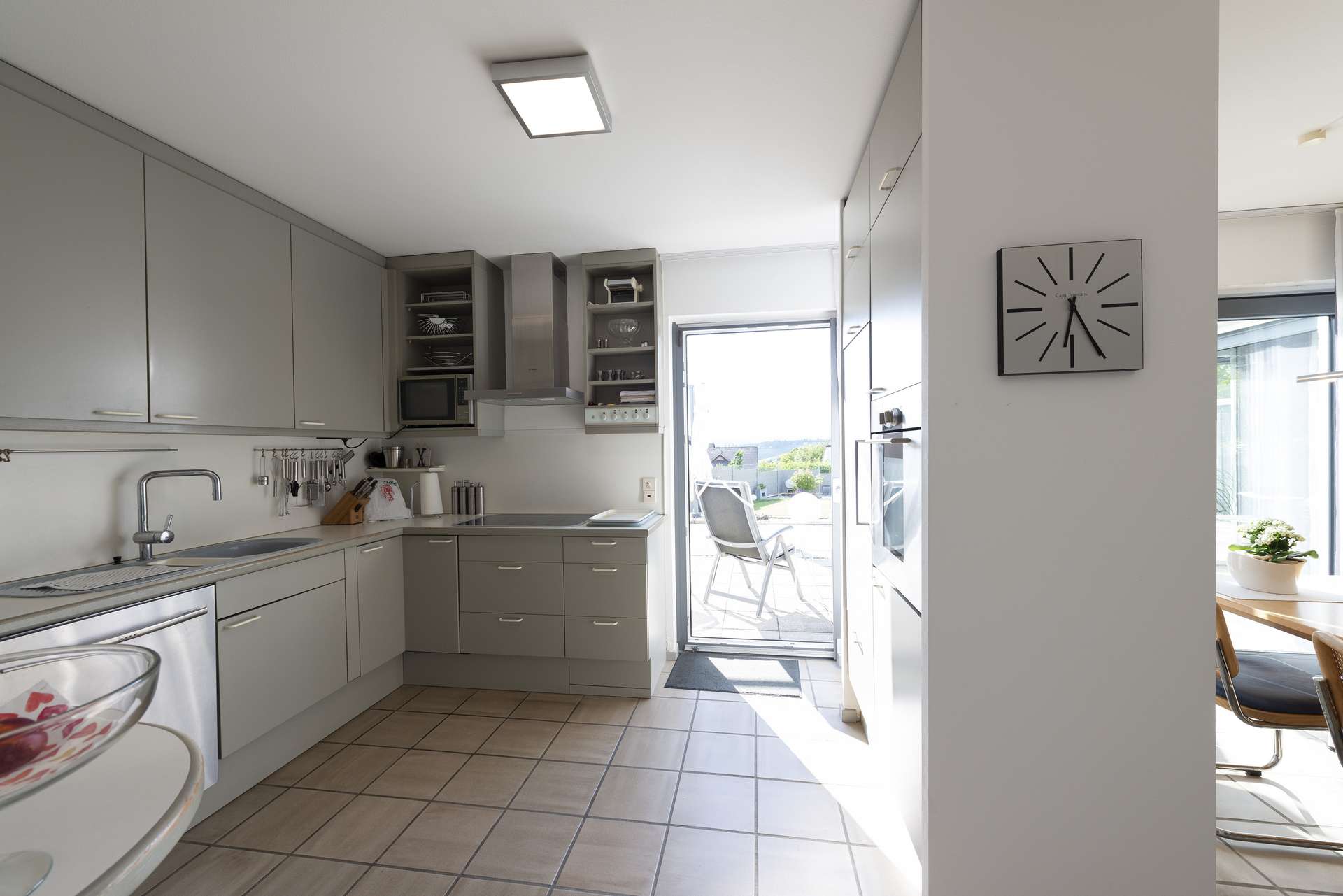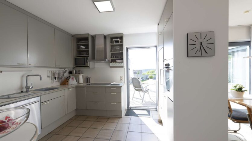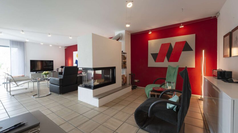 Die Hauptwohnung erstreckt sich über ca. 152 m² Wohnfläche und beeindruckt mit einem offenen, lichtdurchfluteten Wohn- und Essbereich mit direktem Zugang zur einladenden Terrasse und zum Garten. Die offene Küche fügt sich harmonisch in das Raumkonzept ein und schafft eine kommunikative Wohnatmosphäre. Der gemütliche Kaminbereich mit modernem Holzofen (Baujahr 2018, emissionsarm & zukunftssicher) rundet das Herzstück des Hauses perfekt ab. Ein Gäste-WC komplettiert das Erdgeschoss.