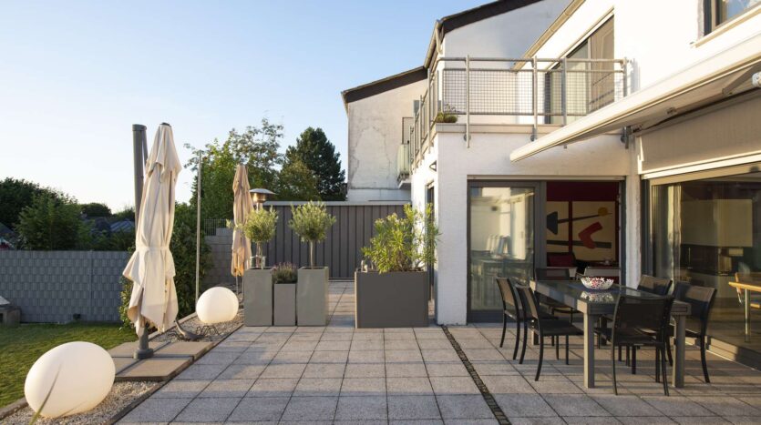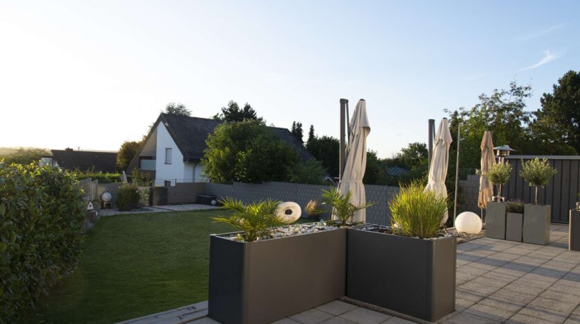 Ein echtes Highlight ist die sonnige Gartenterrasse, die erst 2023 erweitert wurde – perfekt für gesellige Grillabende oder entspannte Familienzeit im Freien. Das ebene, liebevoll neu gestaltete Gartengrundstück (Neuanlage 2011) bietet pflegeleichte Rasenflächen und wird dank Mähroboter und Bewässerungsanlage ganz komfortabel in Schuss gehalten. Ein praktischer Materialschuppen im hinteren Bereich sorgt für ausreichend Stauraum für Gartengeräte.