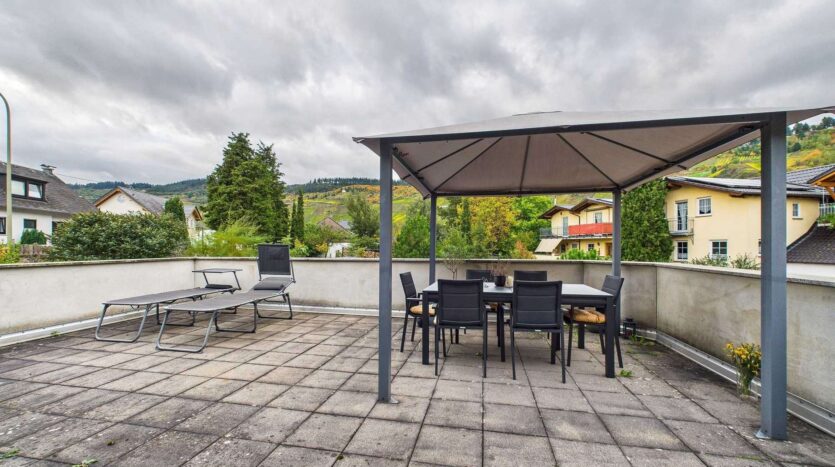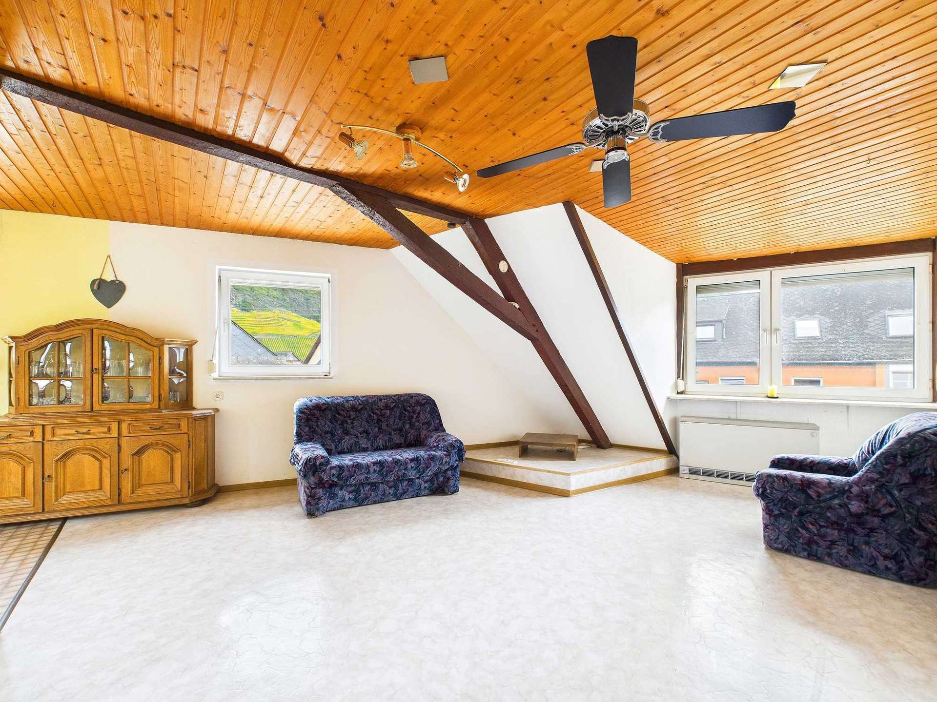 Im ausgebauten Dachgeschoss befindet sich ein weiterer Raum, der flexibel als zusätzliches Schlafzimmer oder Hobbyraum genutzt werden kann. Ein weiteres Duschbad sorgt hier für zusätzlichen Komfort. Zwei Speicher – ein kleinerer und ein größerer – bieten nützliche Abstellmöglichkeiten oder Potenzial für weiteren Ausbau. Ein besonderes Highlight ist die große Dachterrasse, die zum Entspannen und Genießen der Moselsonne einlädt.