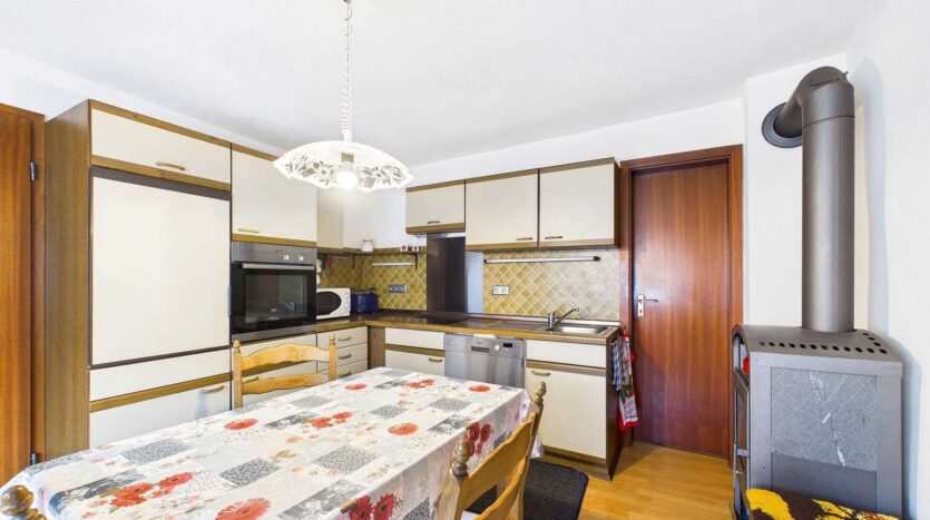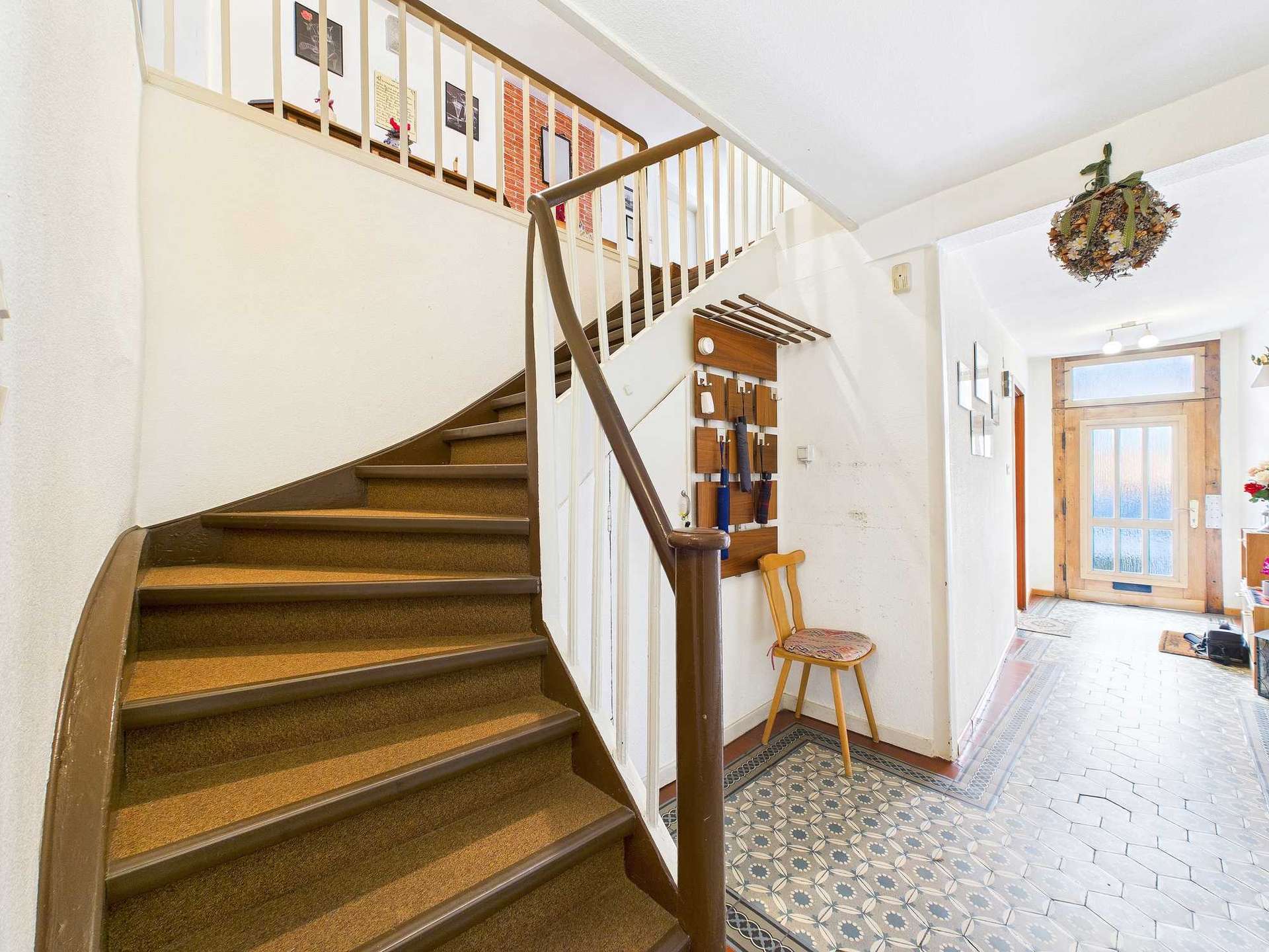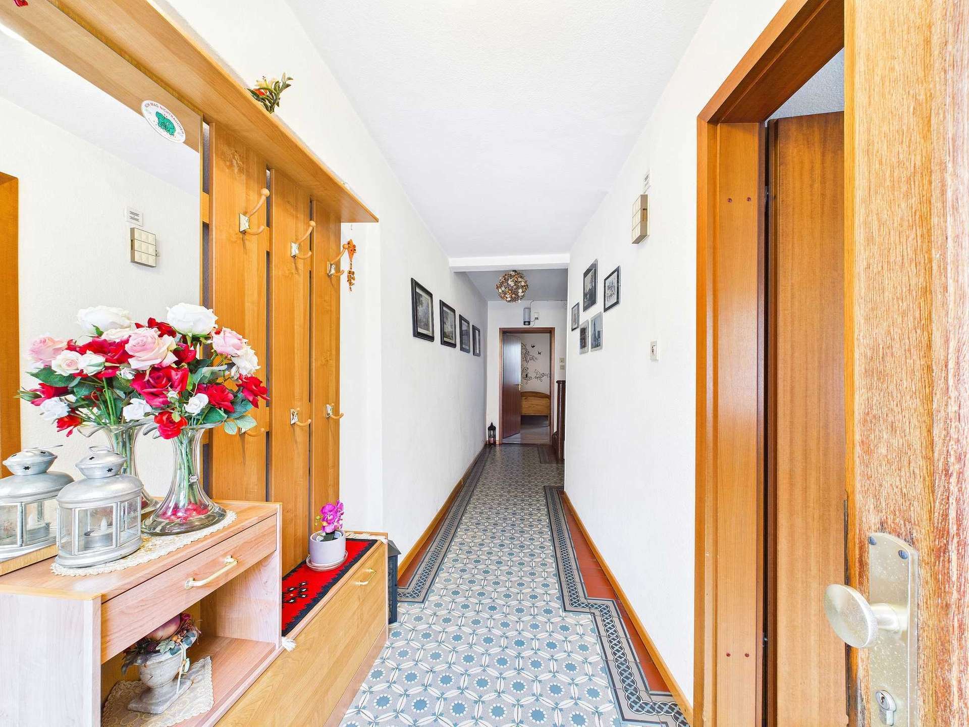 Über eine kleine Treppe gelangt man in das Erdgeschoss des Haupthauses. Schon beim Betreten fällt der Charme vergangener Zeiten auf – der Flur ist mit gut erhaltenen Fliesen aus den 1920er Jahren ausgestattet, die dem Eingangsbereich eine besondere Atmosphäre verleihen. Auf dieser Etage befindet sich eine gemütliche Küche mit Abstellraum und Holzofen, ein wohnliches Wohnzimmer sowie ein Schlafzimmer mit eigenem, innenliegenden Bad aus den späten 1990er Jahren. Diese Ebene eignet sich somit ideal als eigenständige Wohneinheit.