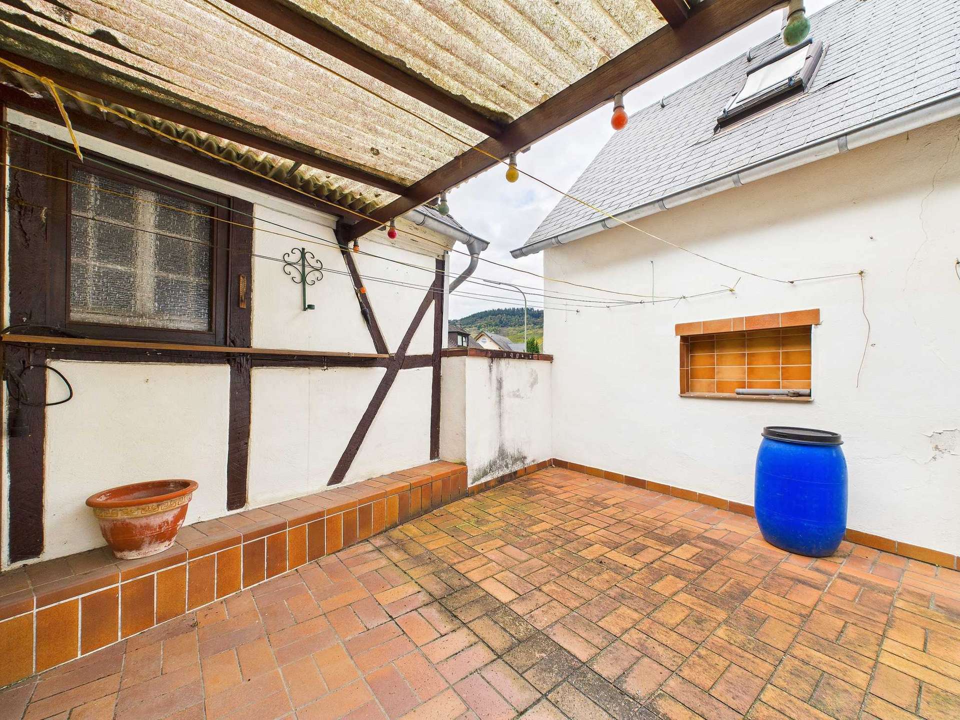 Ein erster Kellerraum ist sowohl vom Hausinneren als auch direkt von der Straße aus zugänglich – optimal als Fahrradkeller oder zur Unterbringung von Müllbehältern. Dahinter befindet sich ein typischer, moselcharakteristischer Fasskeller, der das historische Flair des Gebäudes unterstreicht. Über den Innenhof gelangt man außerdem zu einer größeren Garage bzw. Werkstatt mit vielfältigen Nutzungsmöglichkeiten.