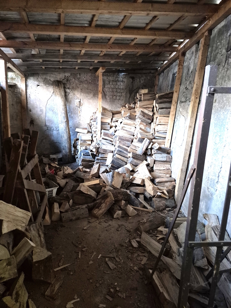 Durch die relativ große Garage, in der neben dem Pkw auch genug Raum für Werkzeug bleibt, gelangt man in einen Holzschuppen.