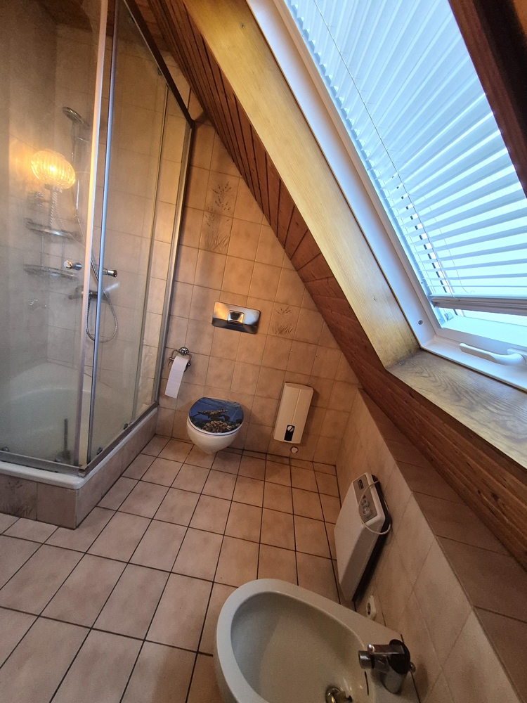 Bisher ist im Dachgeschoss ein Dusch-Bad in der Dachschräge untergebracht, weitere Anschlüsse wären auch im Erdgeschoss verfügbar. Alternativ könnte der Raum auch als Waschküche oder Vorratsraum genutzt werden.