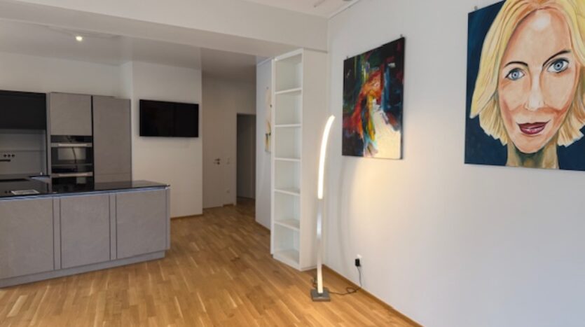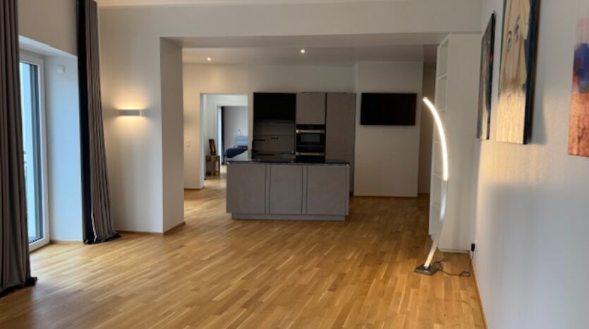 De ruime, lichte woonkamer met open keuken (nauwelijks gebruikt) creëert een uitnodigend ruimtegevoel en overtuigt door de strakke lijnen, hoogwaardige materialen en een harmonieuze kleurstelling.