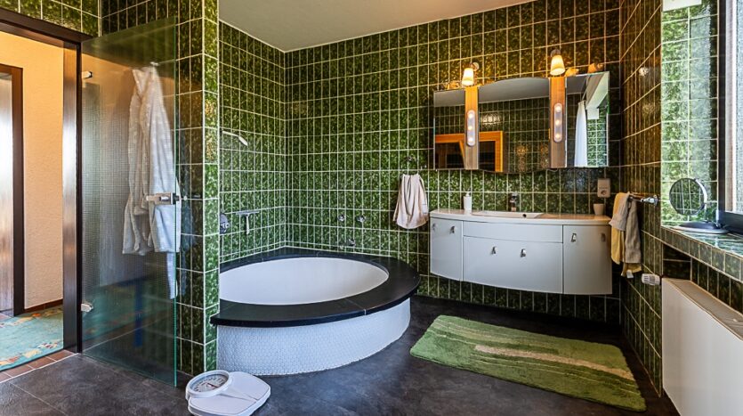 Diele, Küche, Spind, Esszimmer, Wohnzimmer mit Terrassenzugang, Kaminzimmer, Flur, Garderobe, drei Schlafzimmer, Badezimmer mit runder Badewanne (als Dusche genutzt)/WC/Fenster/Wärmekabine, Gäste-WC