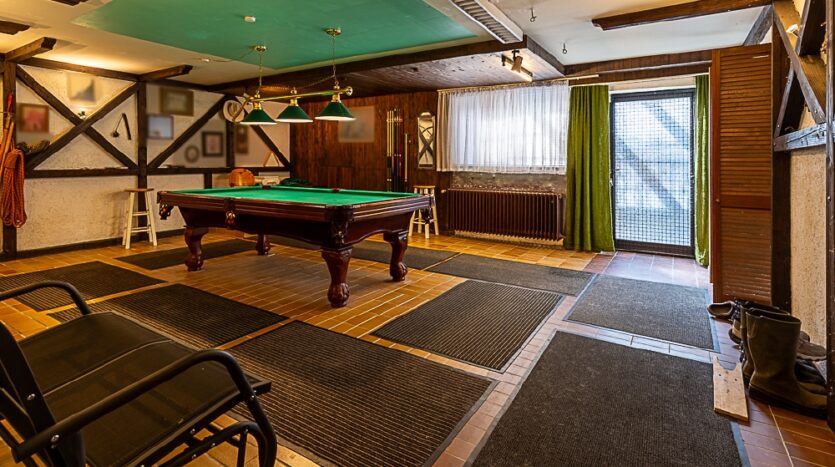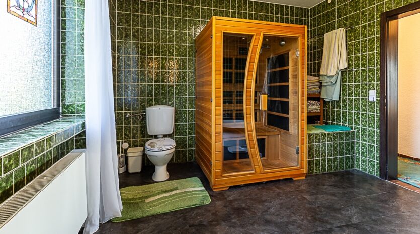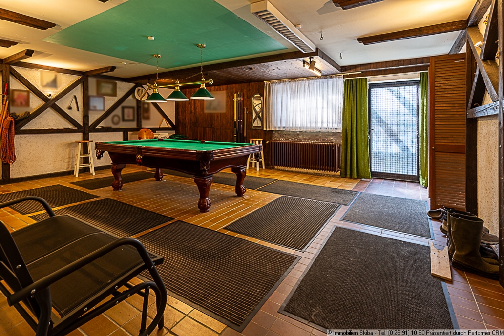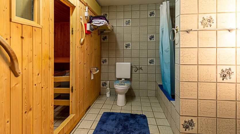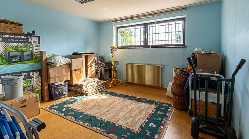 zwei Räume (mit Heizkörpern und Fenstern), großer Hobbyraum mit Ausgang, Flur, Sauna mit Dusche/WC, Waschküche, Vorratsraum, Werkraum, Heizungsraum und Pelletlager