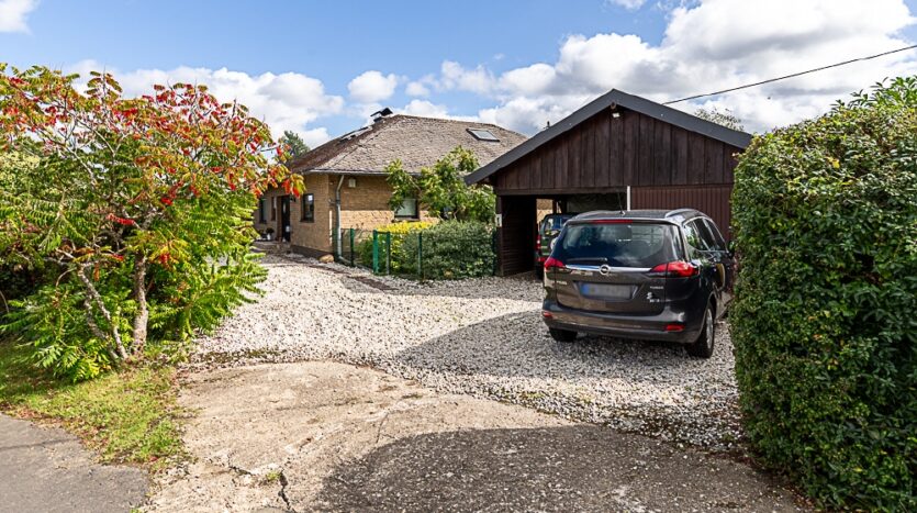 – Stevige prefab garage en houten carport met zadeldak en houtopslag naast het huis