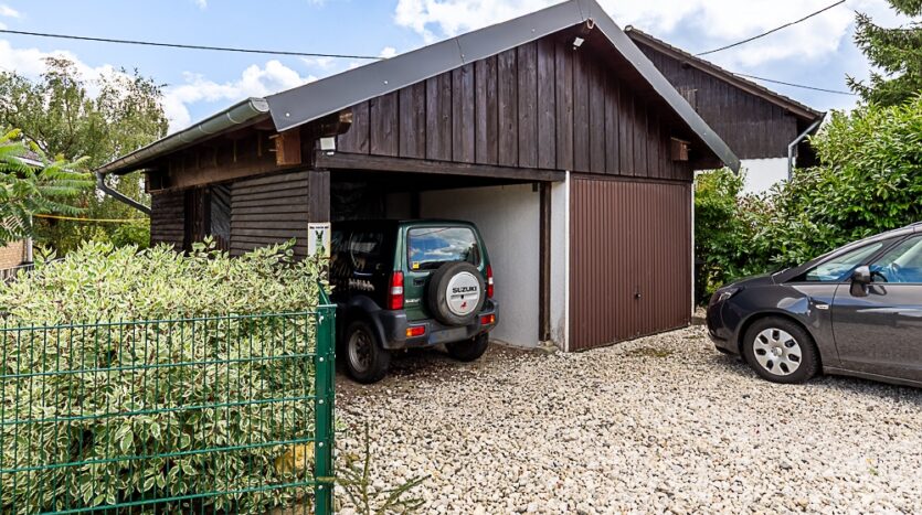 - massive Fertiggarage sowie Holz-Carport mit Satteldach und Holzlager neben dem Haus