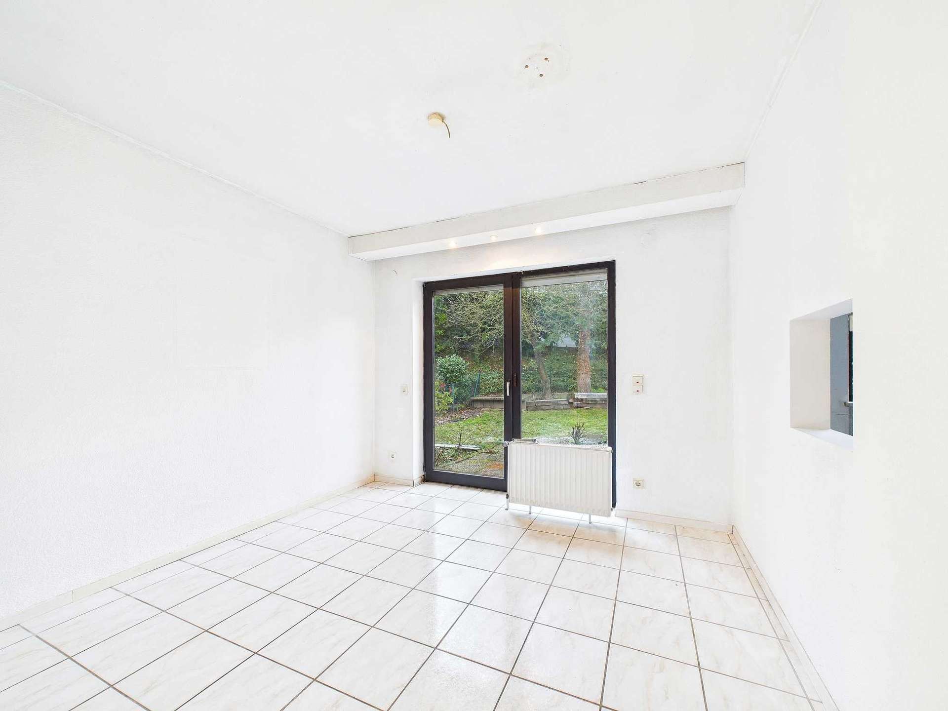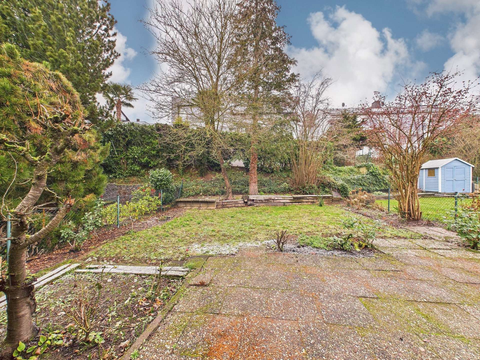 Vom Wohn- und Essbereich aus gelangt man zudem auf die Terrasse und in den Garten hinter dem Haus. Dieser private Außenbereich bietet Raum für Erholung, Spiel und gesellige Stunden im Freien. Über eine kleine Treppe erreicht man eine weitere, seitlich gelegene Terrasse, auf der sich aktuell ein praktischer Geräteschuppen für Gartenutensilien, Grill und Freizeitbedarf befindet.