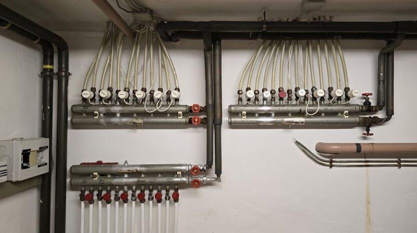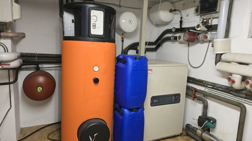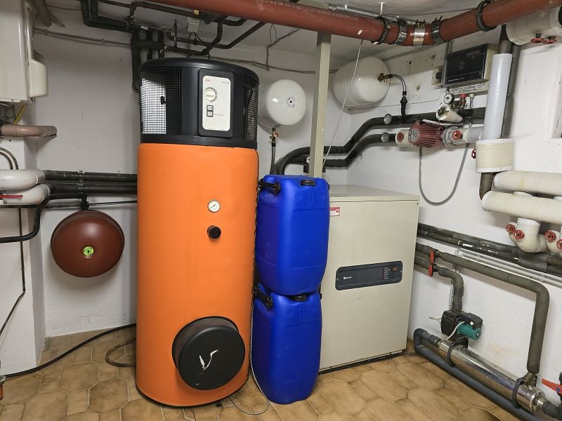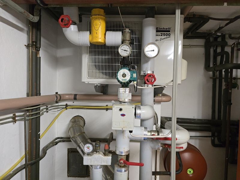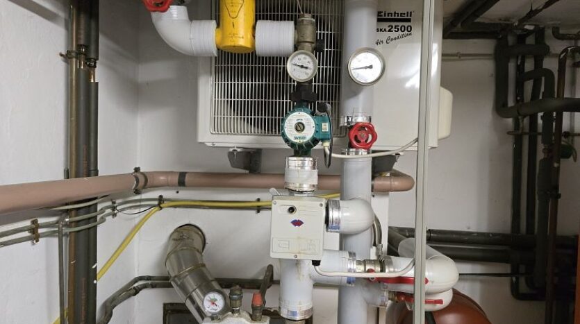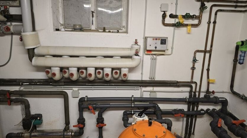 De bestaande oliegestookte verwarming kan, afhankelijk van het seizoen, worden ingeschakeld om het buitenzwembad sneller te verwarmen.