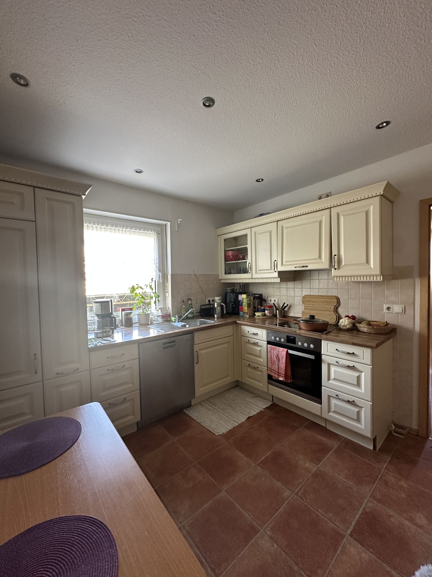 ansonsten: Fliesen, Echtholzparkett, PVC in der Küche